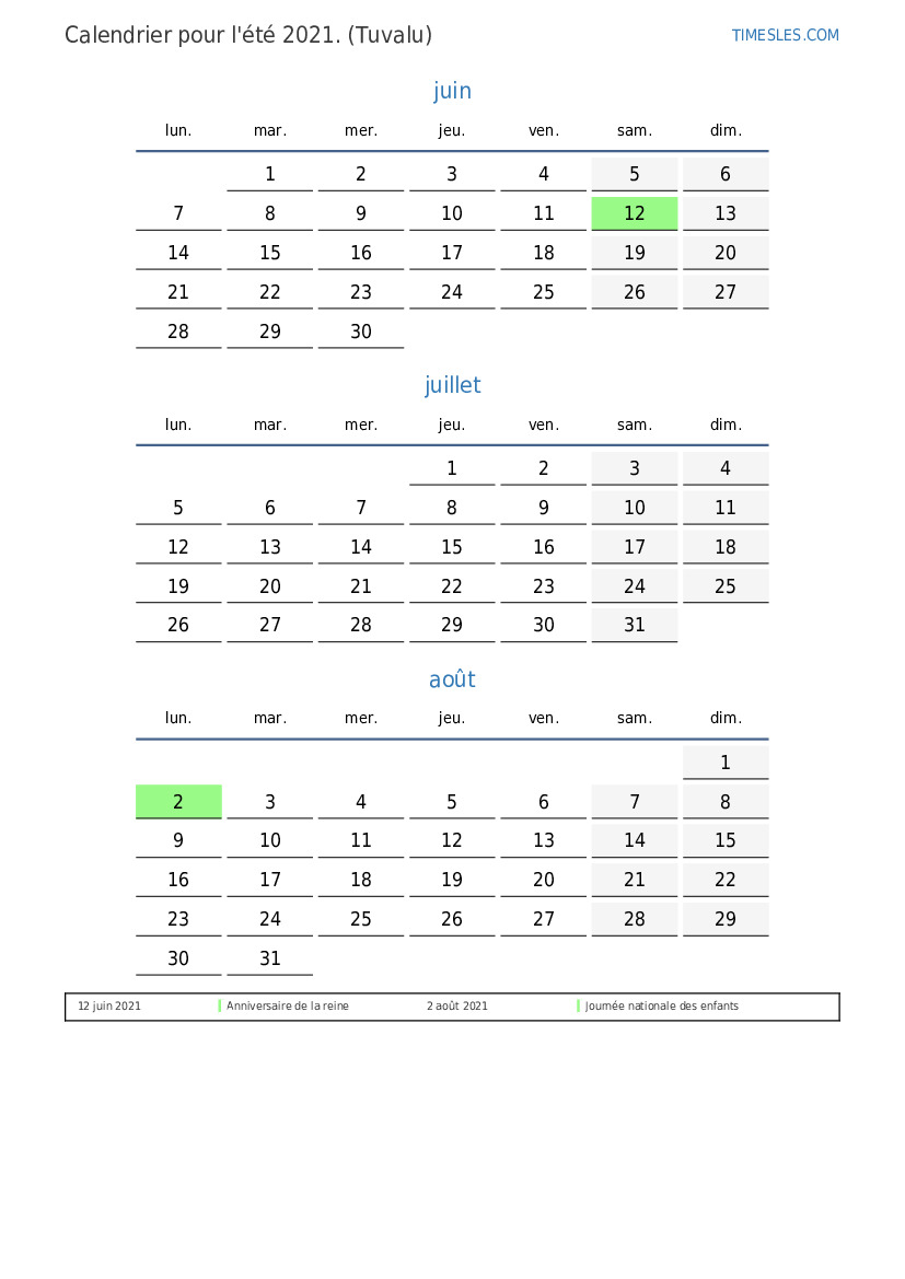 Calendrier des jours fériés et des week-ends pour l'été 2021 pour Tuvalu