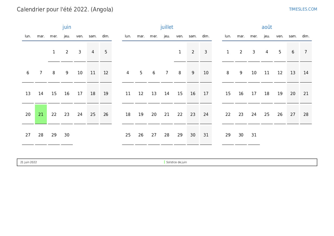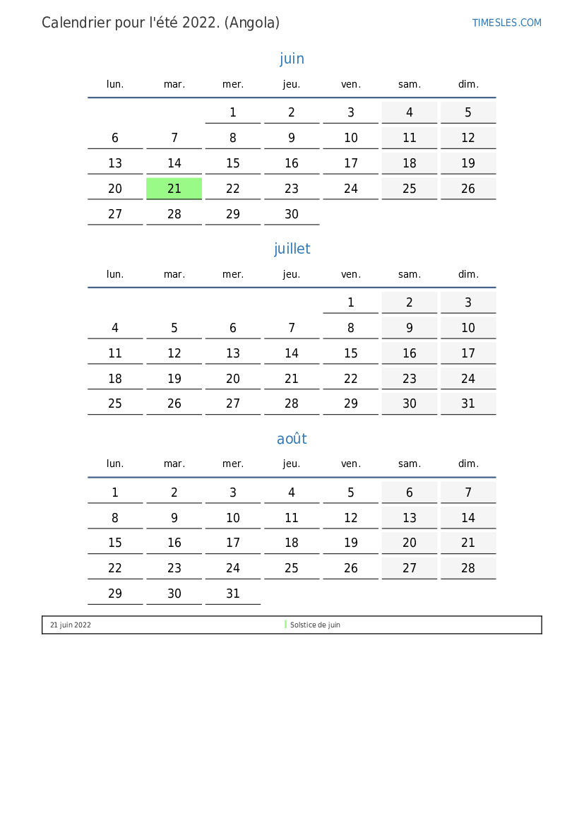 Téléchargez et imprimez le calendrier PDF avec les jours fériés et les week-ends pour l'été 2022 pour l'Angola