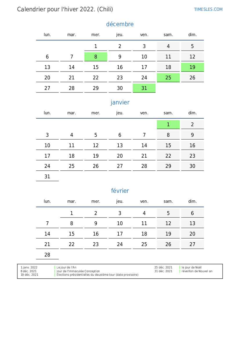 Calendrier pour l'été 2022 au Chili