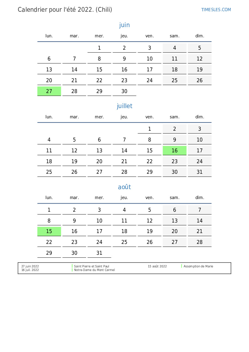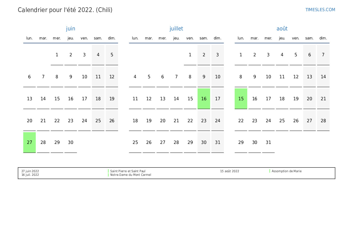 Calendrier des jours fériés et des week-ends pour l'été 2022 pour le Chili