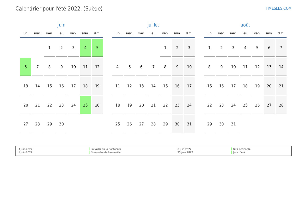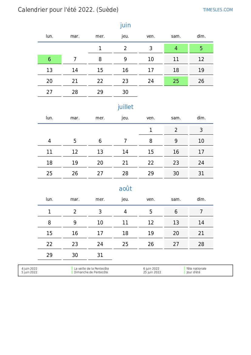 Téléchargez et imprimez le calendrier PDF avec les jours fériés et les week-ends pour l'été 2022 pour la Suède