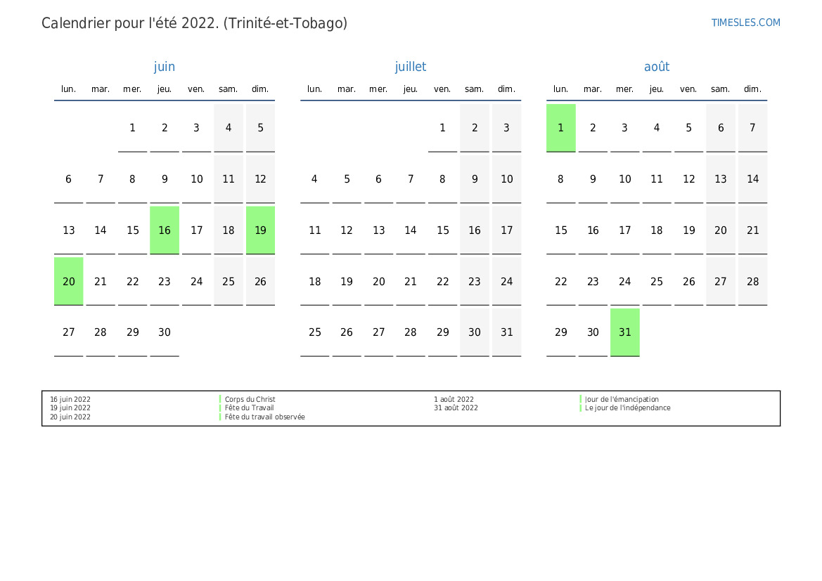 Calendrier des jours fériés et des week-ends pour l'été 2022 pour Trinité-et-Tobago