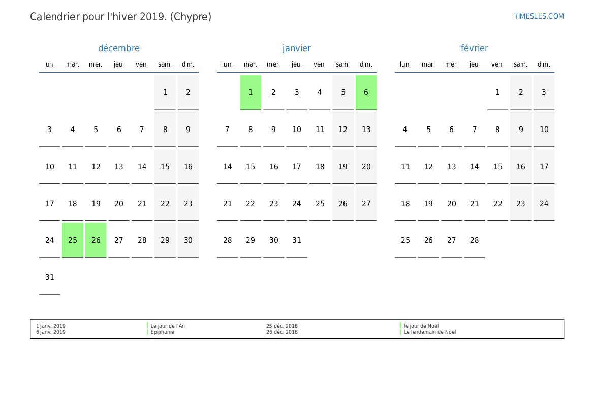 Téléchargez et imprimez le calendrier PDF avec les jours fériés et les week-ends pour l'hiver 2019 pour Chypre