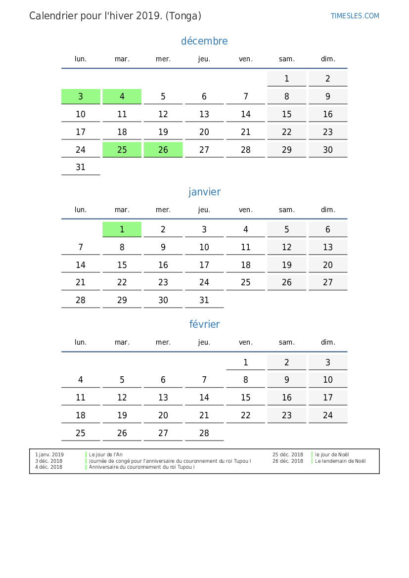 3 déc. 2018 Journée de congé pour l'anniversaire du couronnement du roi Tupou I