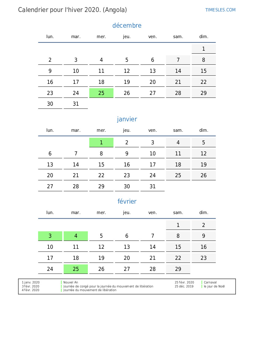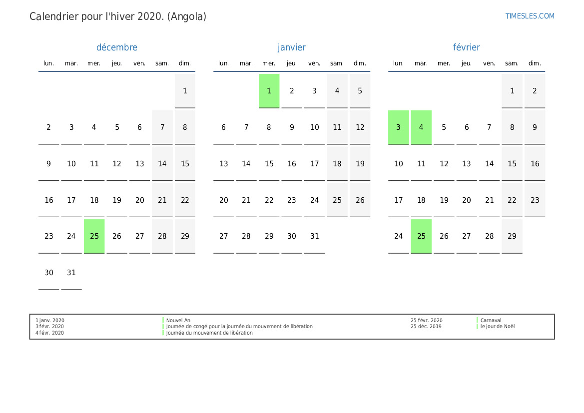 Téléchargez et imprimez le calendrier PDF avec les jours fériés et les week-ends pour l'hiver 2020 pour l'Angola