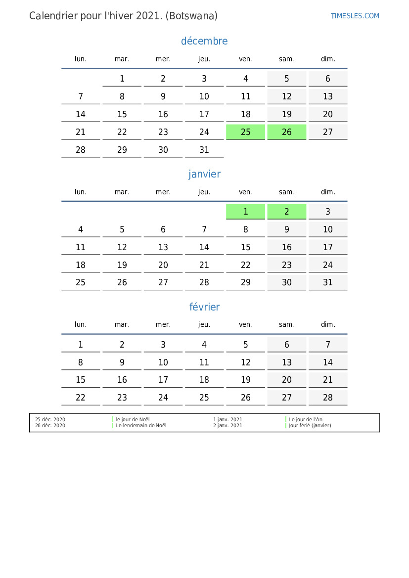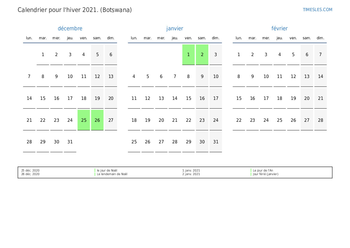 Téléchargez et imprimez le calendrier PDF avec les jours fériés et les week-ends pour l'hiver 2021 pour le Botswana