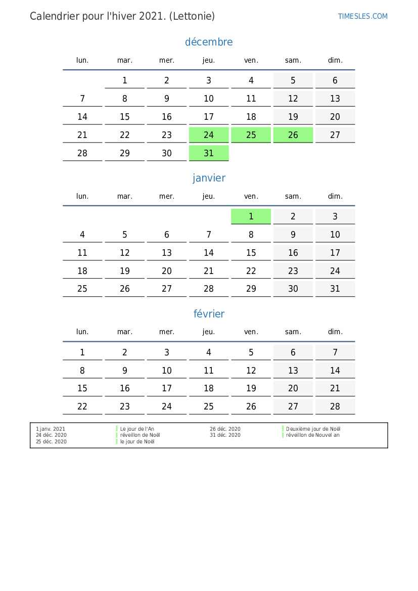 Téléchargez et imprimez le calendrier PDF avec les jours fériés et les week-ends pour l'hiver 2021 pour la Lettonie