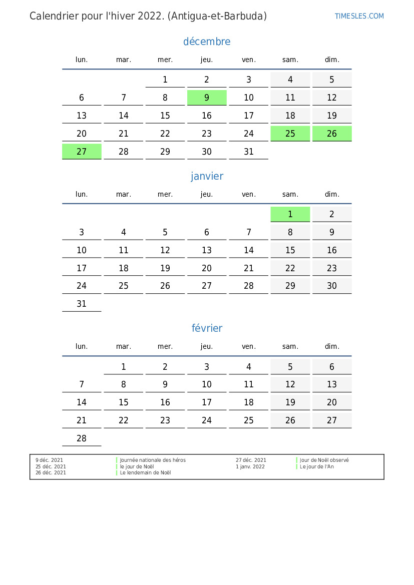Téléchargez et imprimez le calendrier PDF avec les jours fériés et les week-ends pour l'hiver 2022 pour Antigua et Barbuda