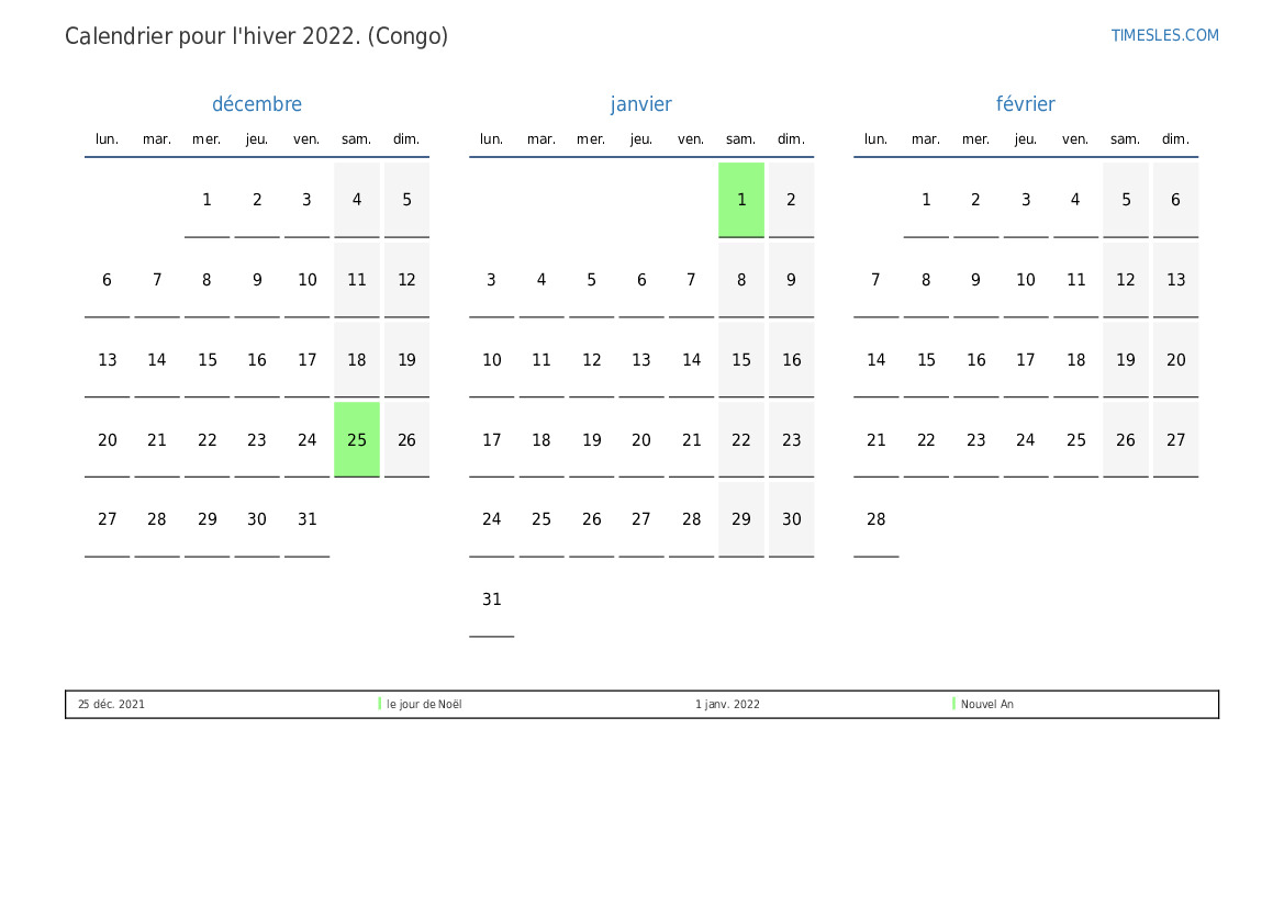 Téléchargez et imprimez le calendrier PDF avec les jours fériés et les week-ends pour l'hiver 2022 pour le Congo