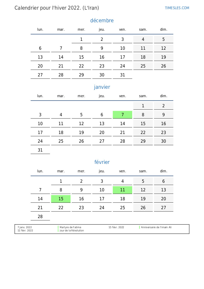 Téléchargez et imprimez le calendrier PDF avec les jours fériés et les week-ends pour l'hiver 2022 pour l'Iran