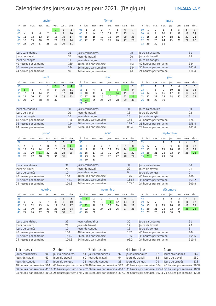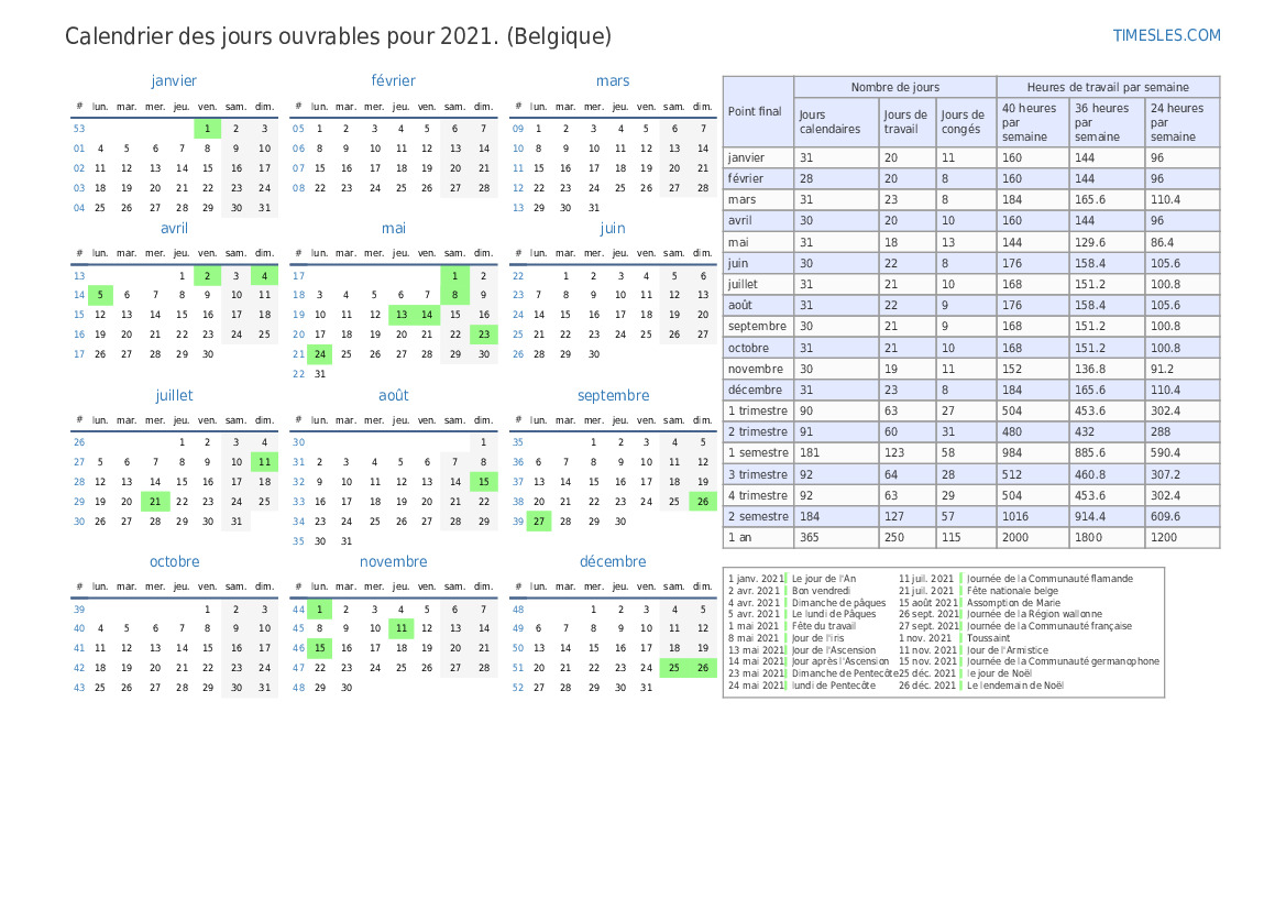Téléchargez et imprimez le calendrier des jours ouvrables PDF pour octobre 2021 pour la Belgique