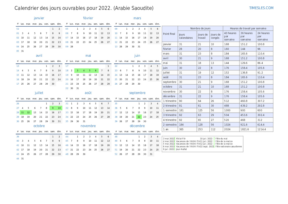 Jours ouvrables pour janvier 2022 pour l'Arabie saoudite