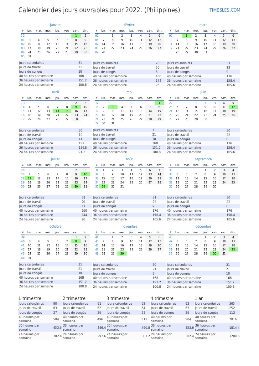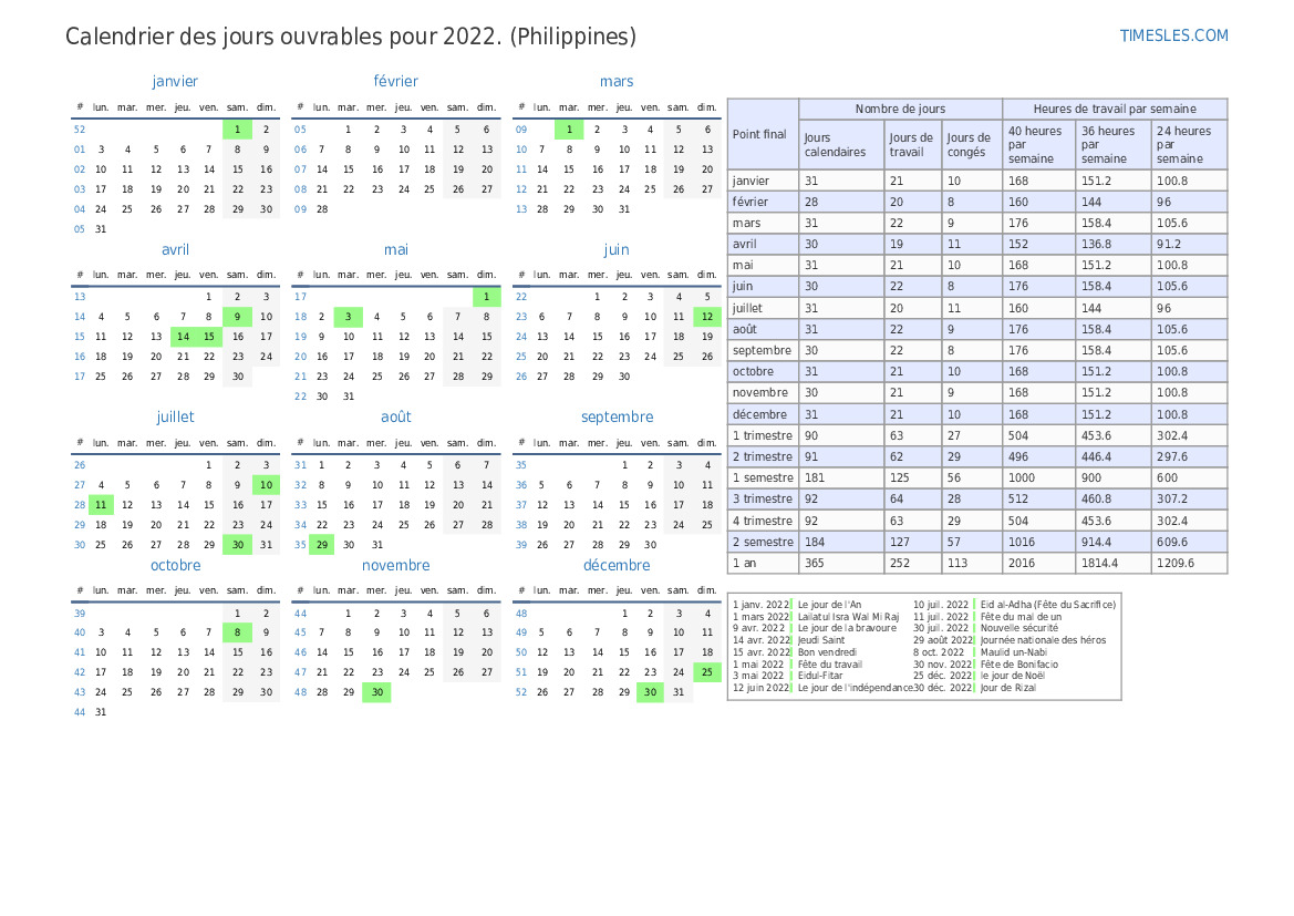 Jours ouvrables pour juin 2022 pour les Philippines