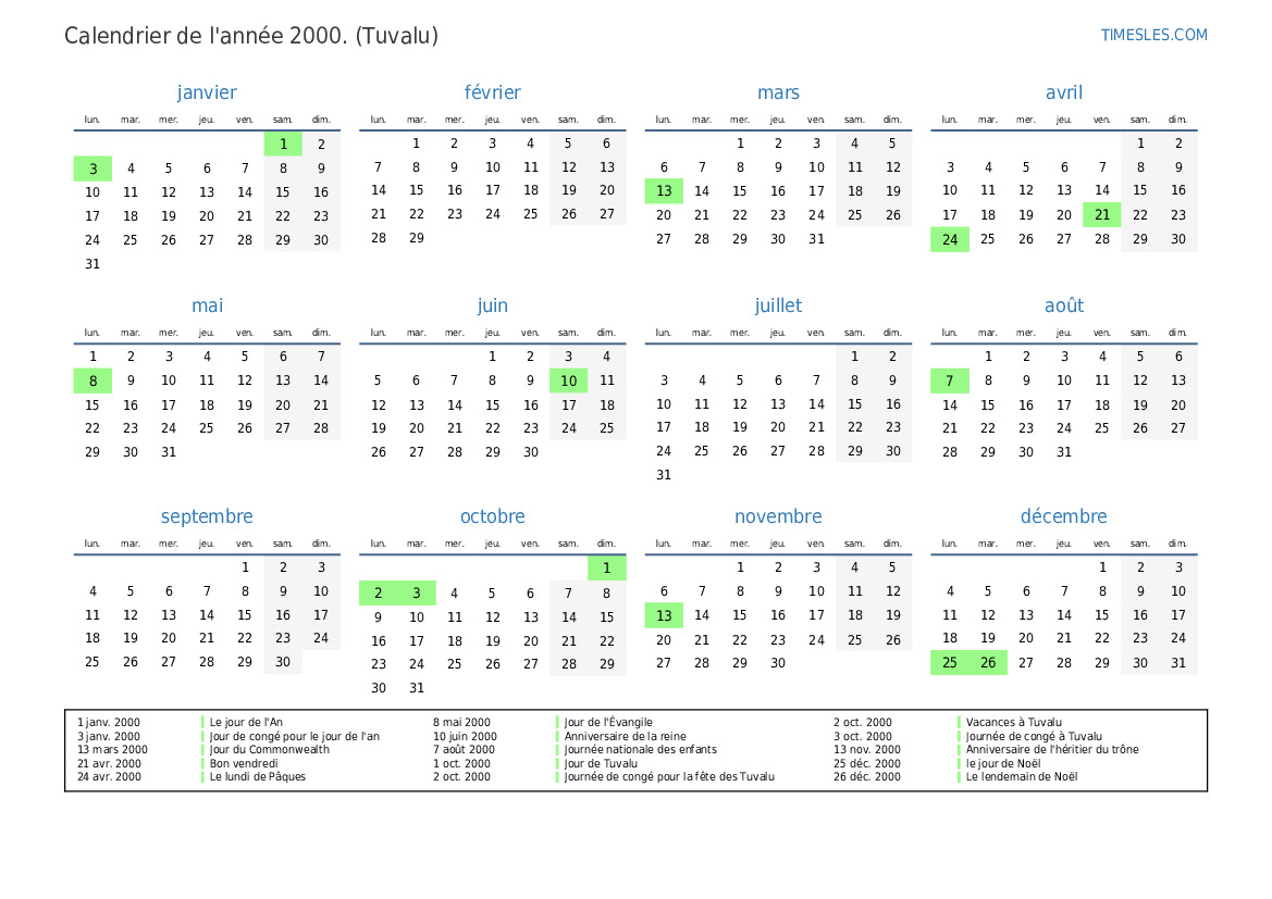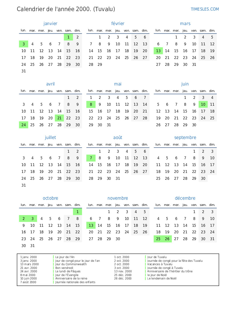 2 oct. 2000 Journée de congé pour la fête des Tuvalu