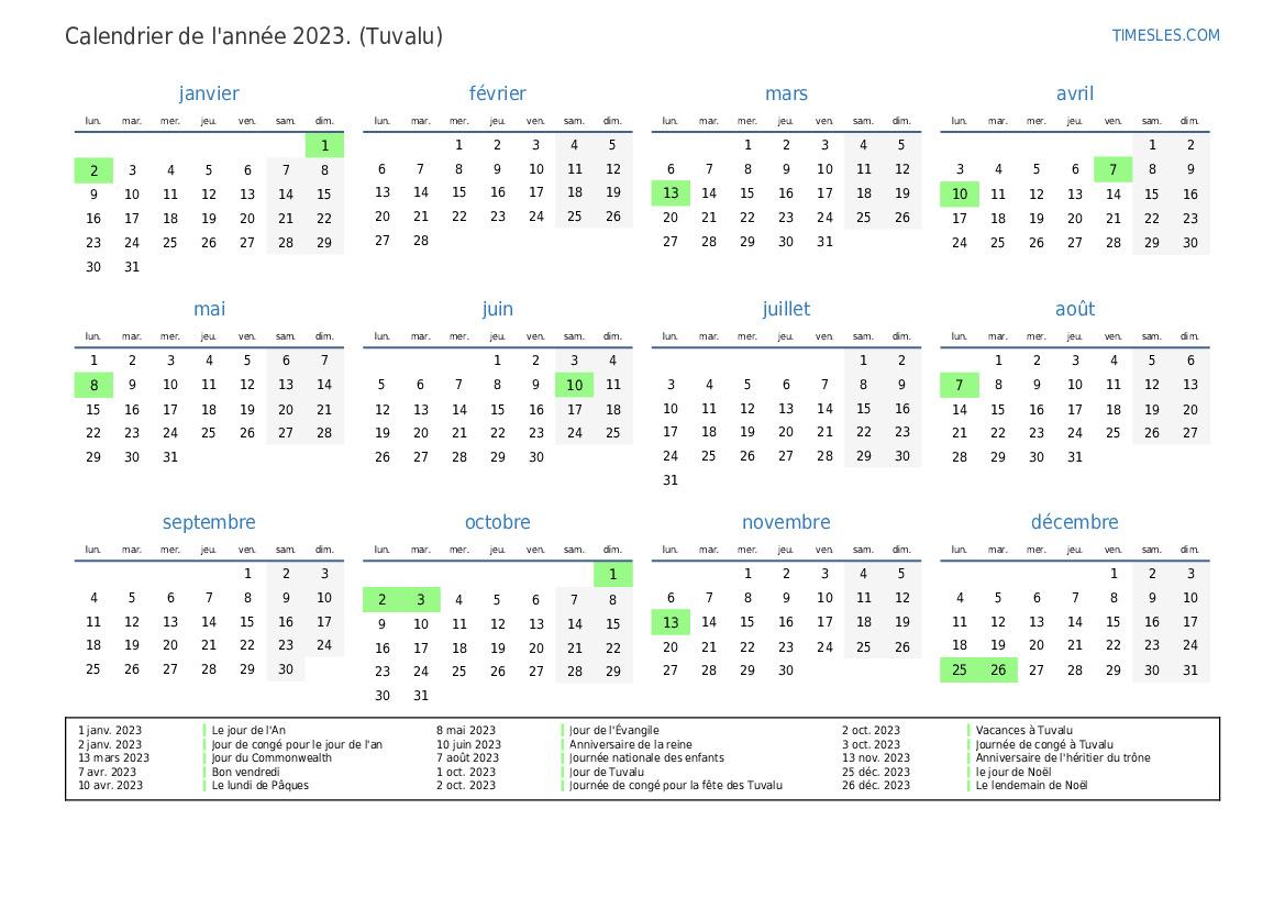 2 oct. 2023 Journée de congé pour la fête des Tuvalu