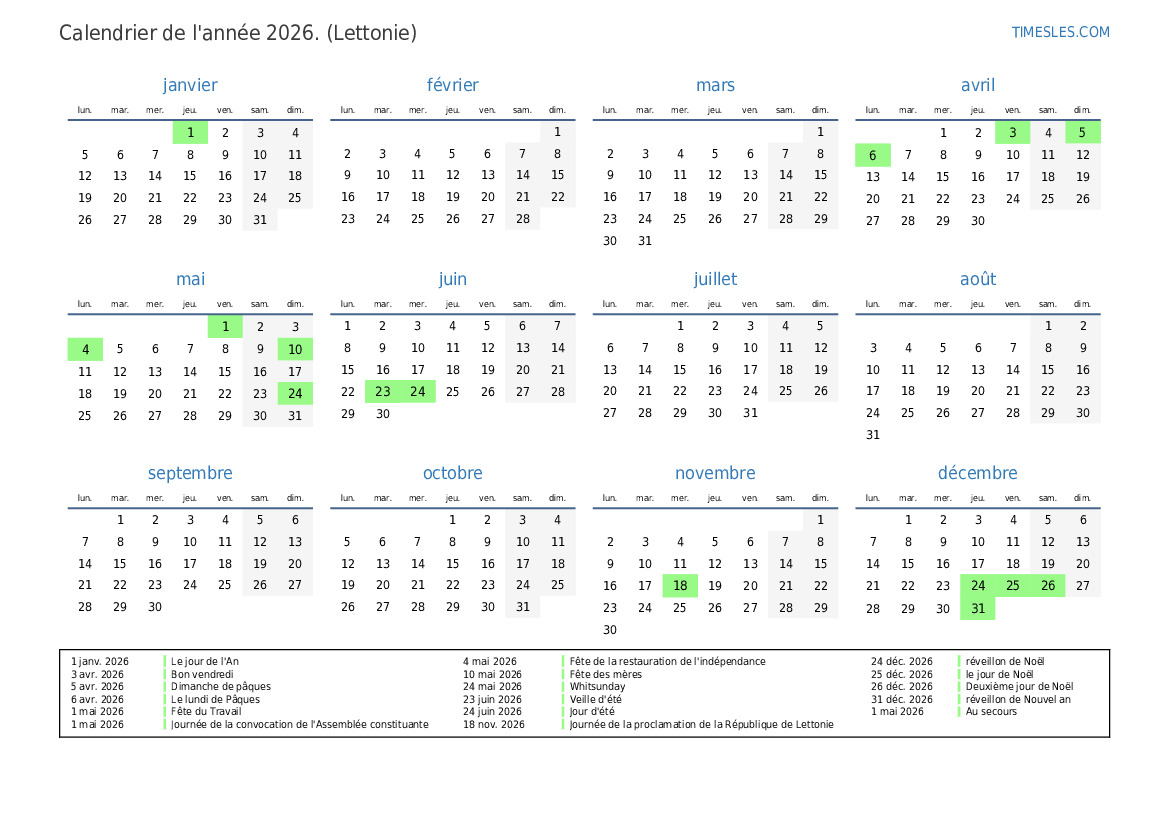 18 nov. 2026 Journée de la proclamation de la République de Lettonie