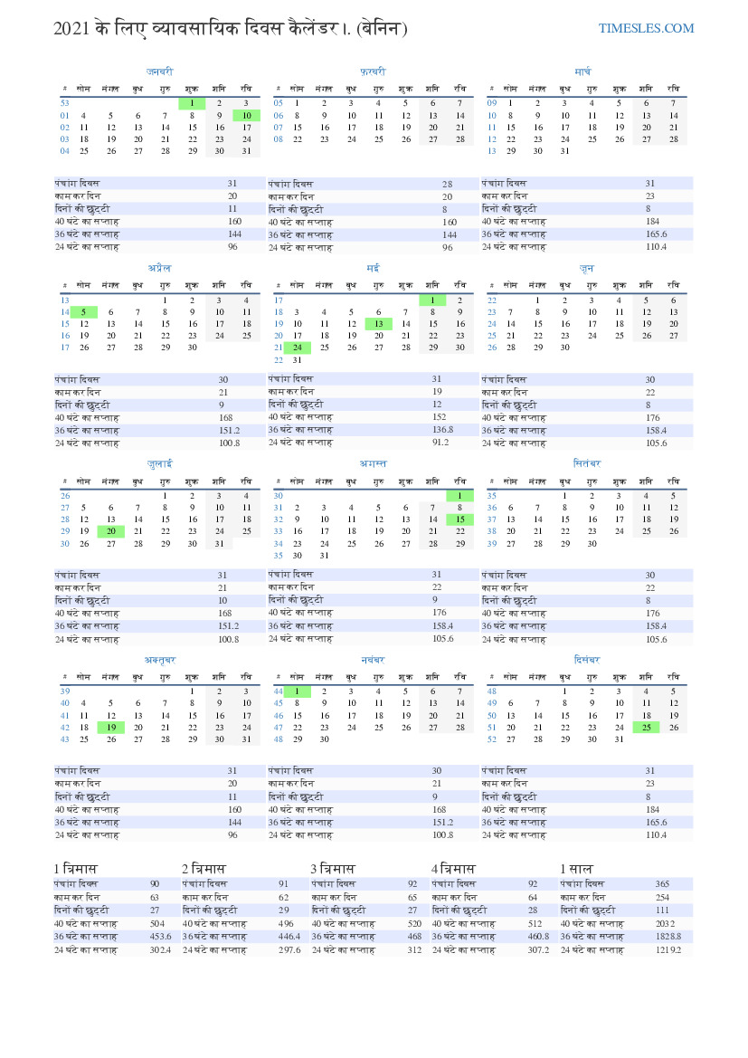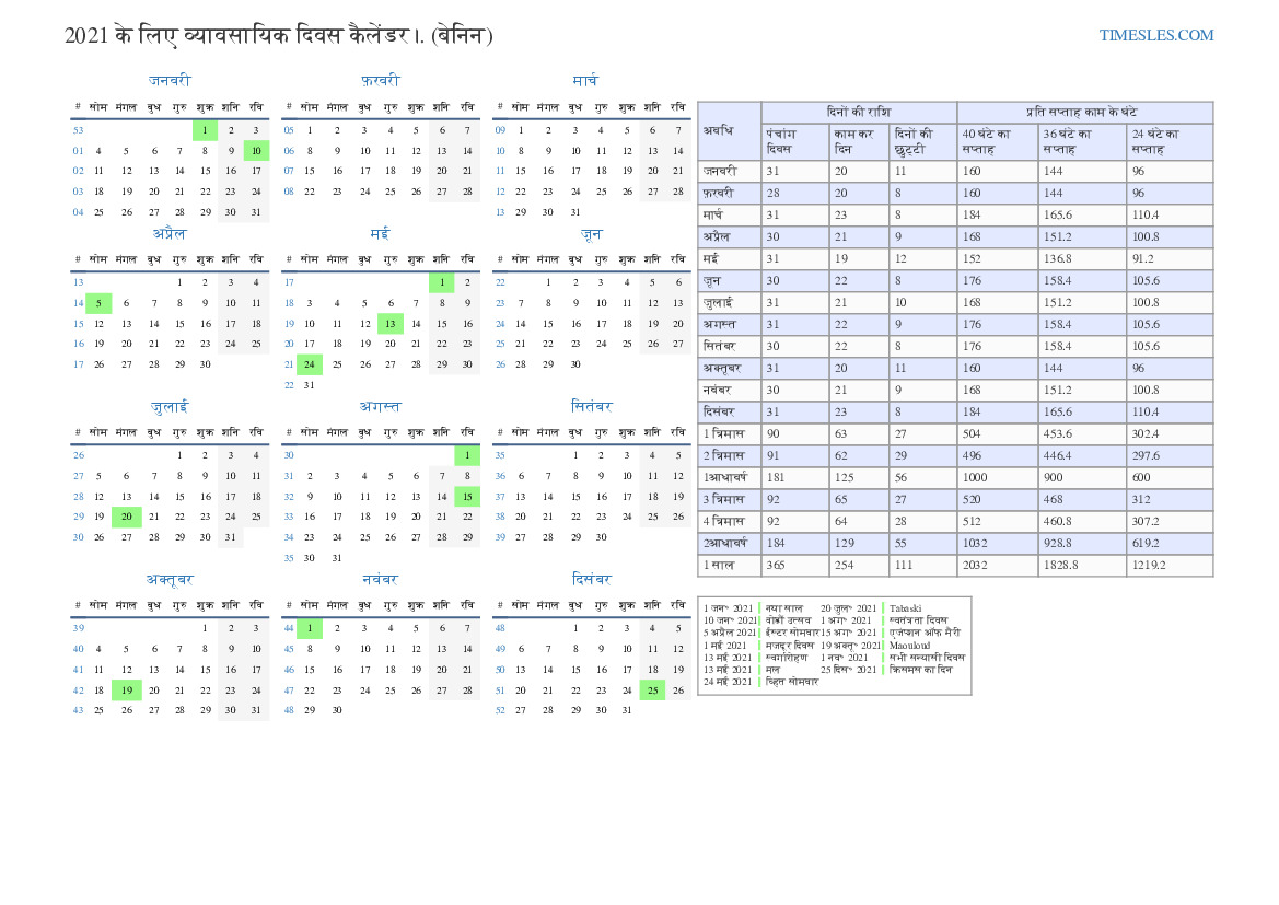 जनवरी 2021 बेनिन के लिए व्यावसायिक दिवस कैलेंडर