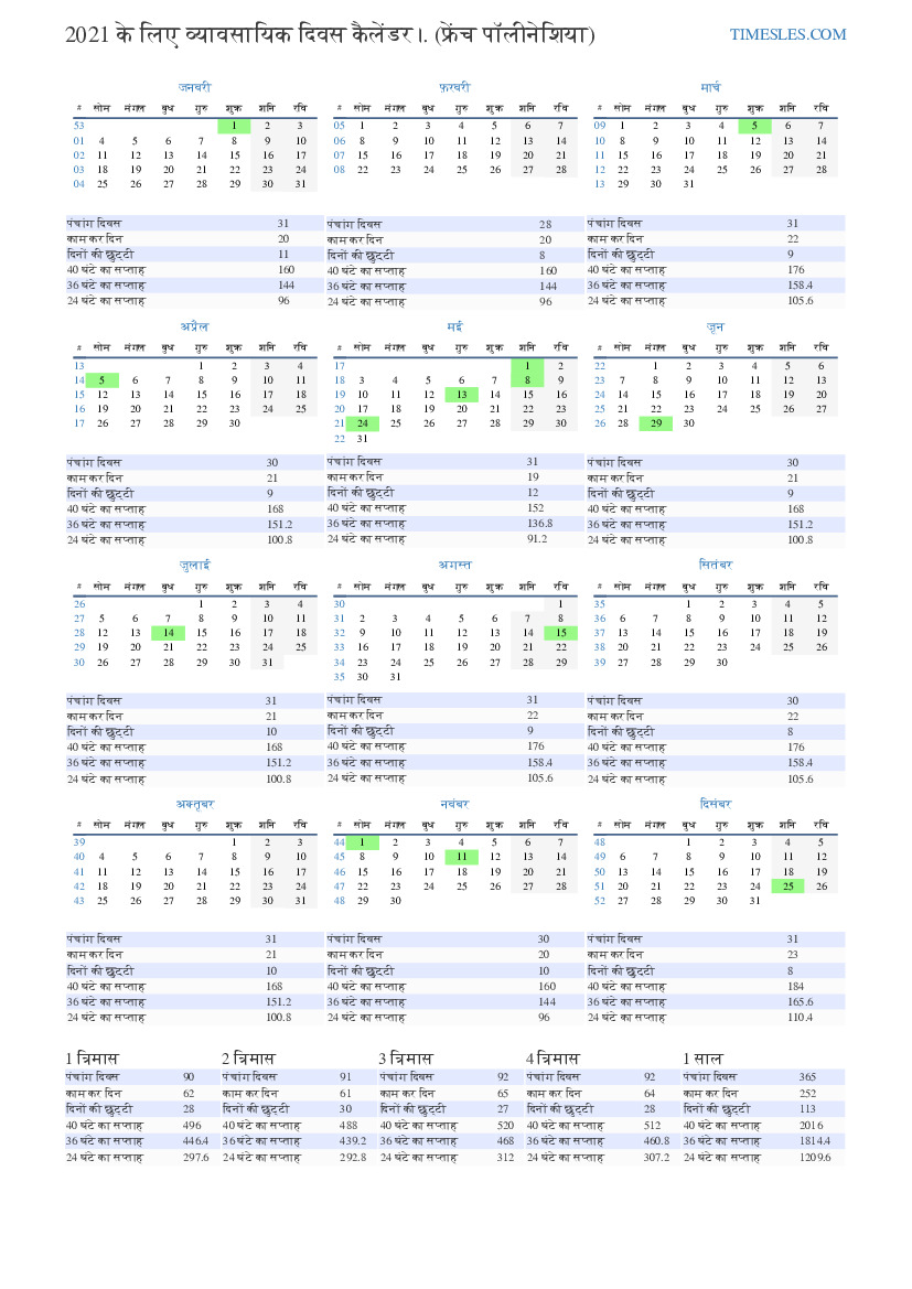 जून 2021 फ्रेंच पोलिनेशिया के लिए व्यावसायिक दिवस कैलेंडर