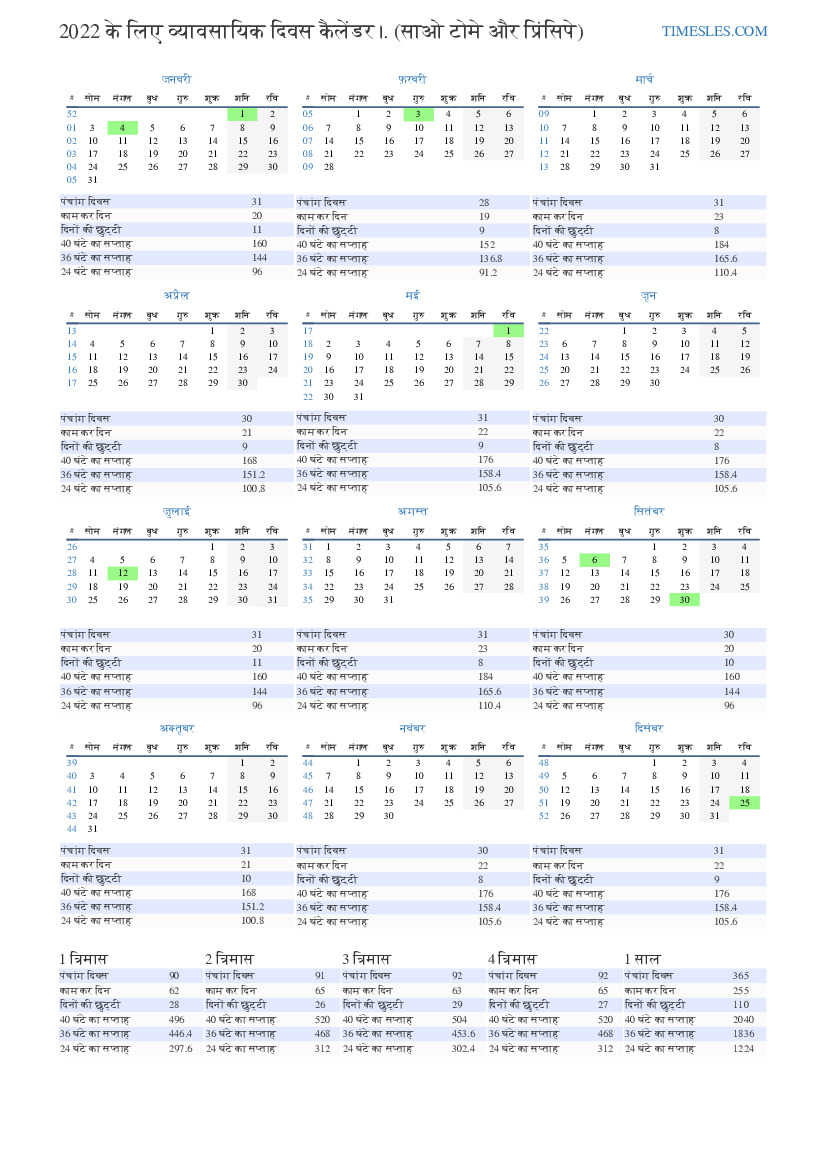 जनवरी 2022 साओ टोम और प्रिंसिपे के लिए व्यावसायिक दिवस कैलेंडर