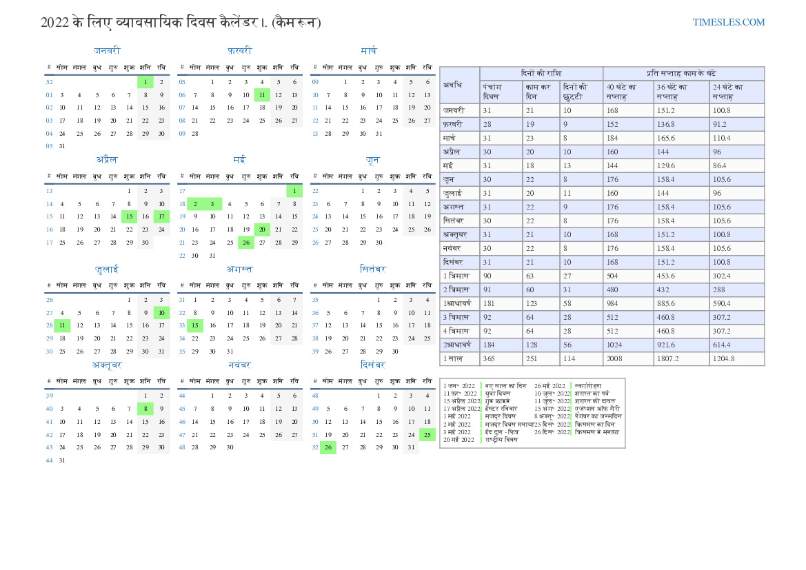 नवंबर 2022 कैमरून के लिए व्यावसायिक दिवस कैलेंडर