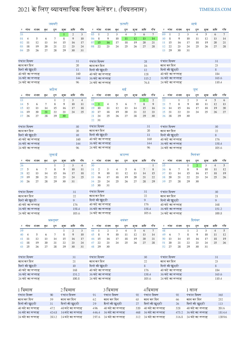 वियतनाम के लिए 2021 की 1 तिमाही के लिए छुट्टियों और सप्ताहांत के साथ व्यावसायिक दिन कैलेंडर