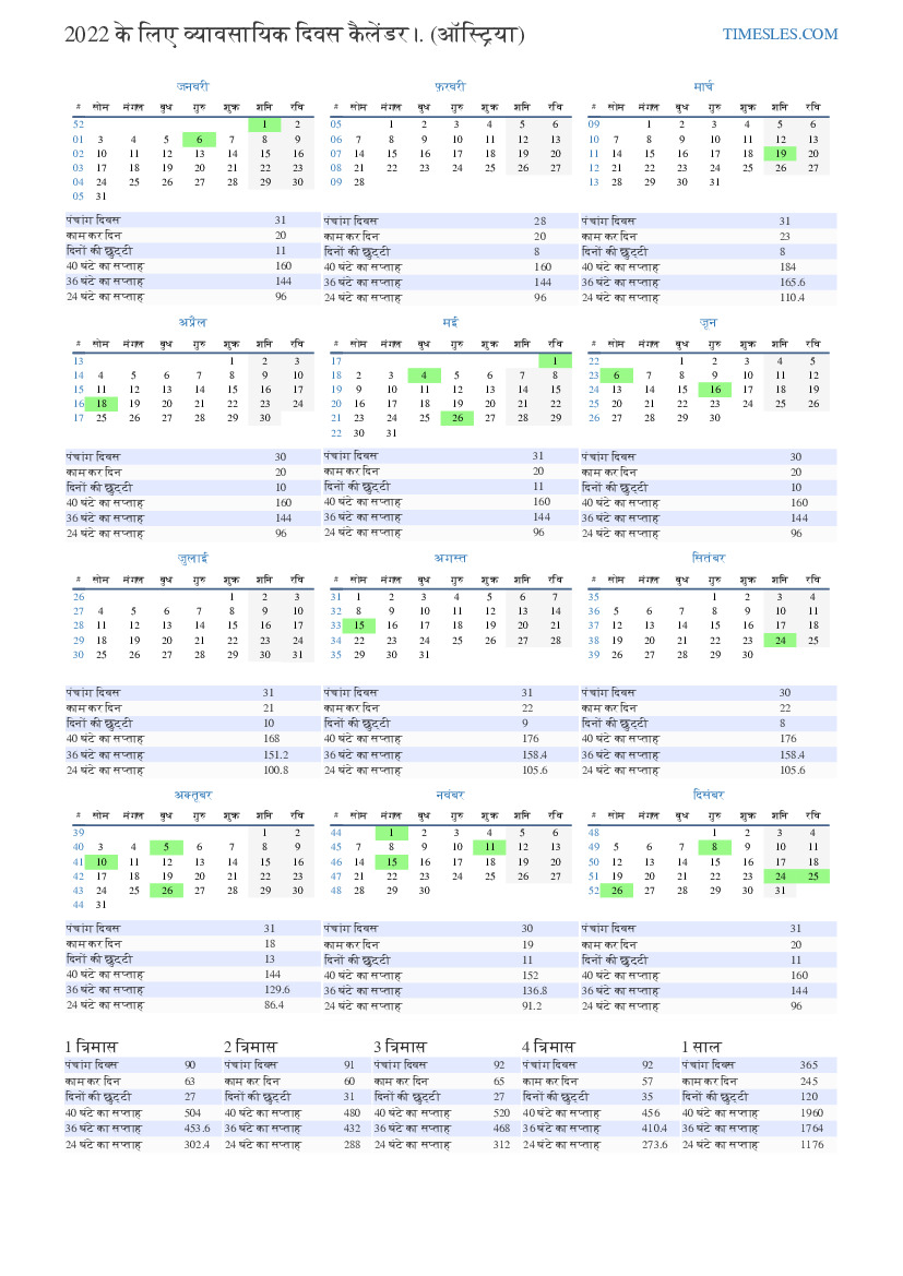 ऑस्ट्रिया के लिए 2022 की 1 तिमाही के लिए छुट्टियों और सप्ताहांत के साथ व्यावसायिक दिन कैलेंडर