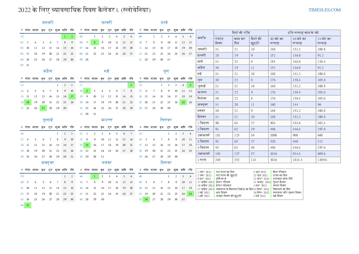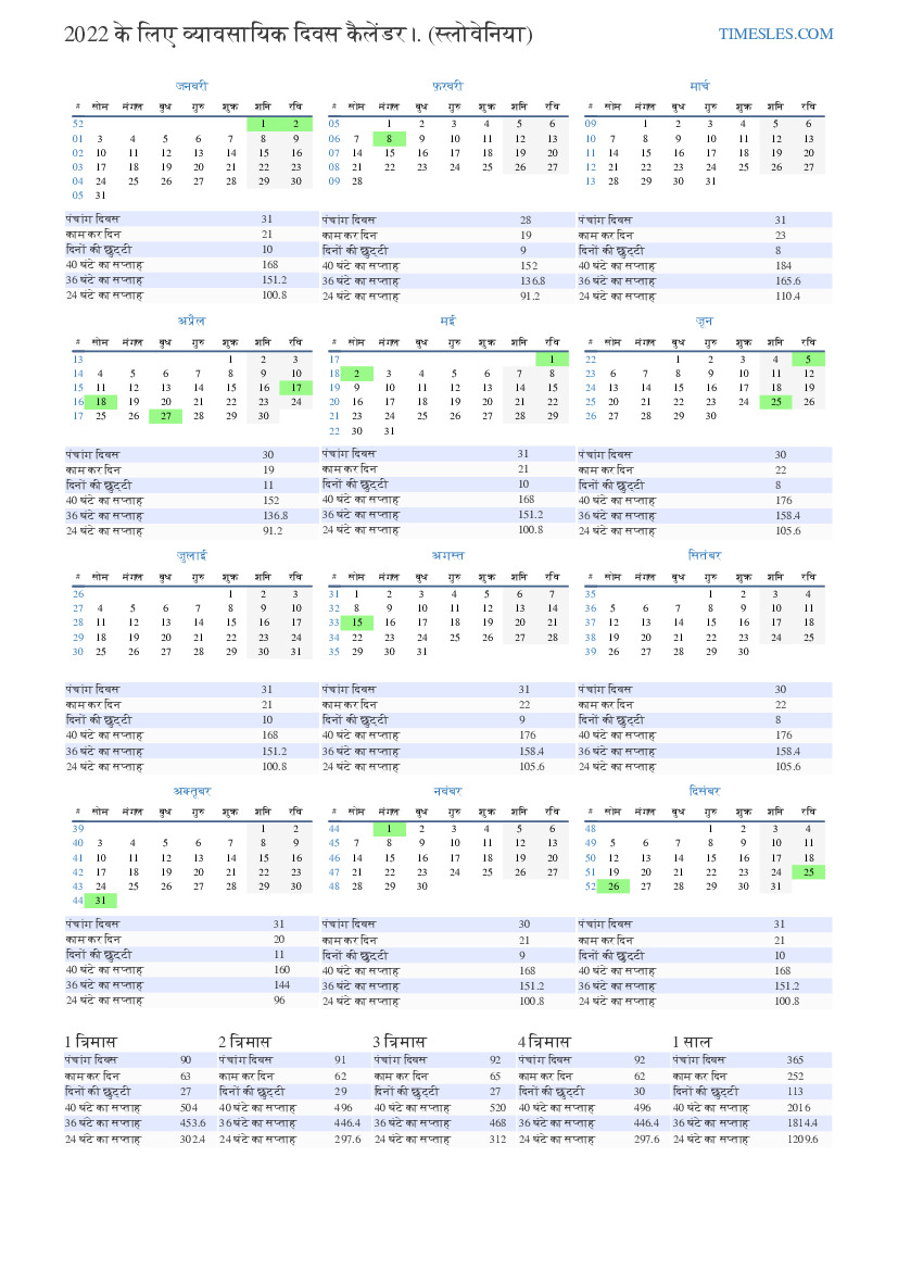 स्लोवेनिया के लिए 2022 की 1 तिमाही के लिए छुट्टियों और सप्ताहांत के साथ व्यावसायिक दिन कैलेंडर