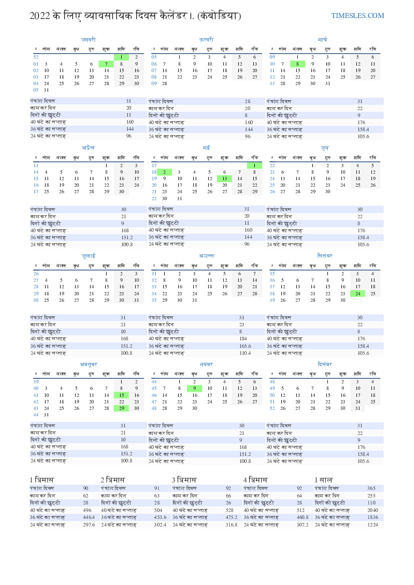 कंबोडिया के लिए 2022 की 4 तिमाही के लिए छुट्टियों और सप्ताहांत के साथ व्यावसायिक दिन कैलेंडर