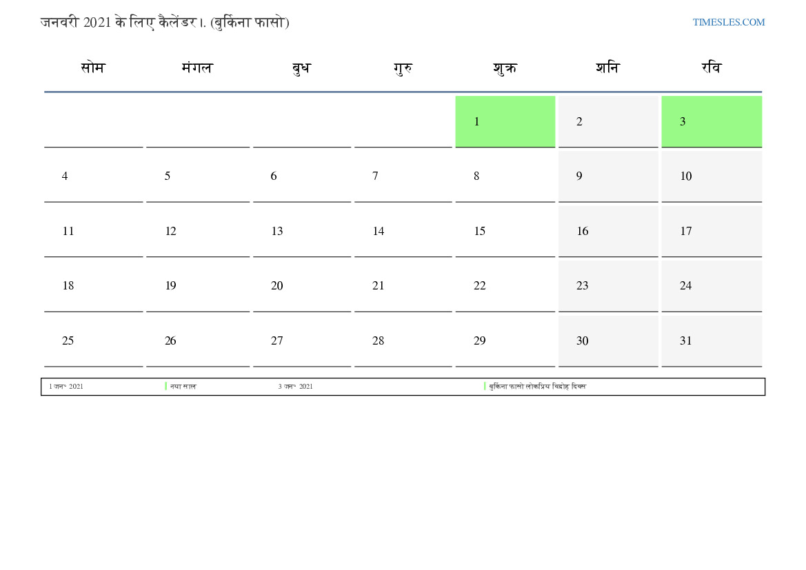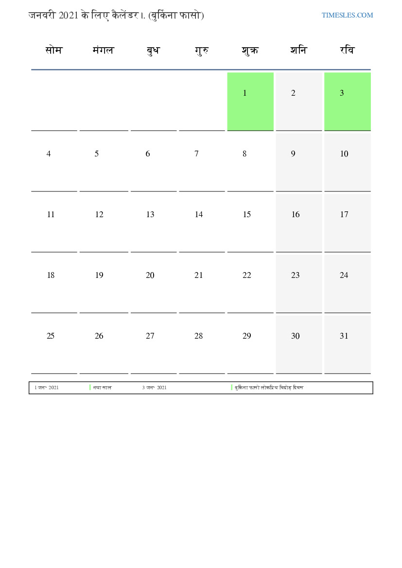 बुर्किना फासो के लिए जनवरी 2021 के लिए छुट्टियों और सप्ताहांत कैलेंडर