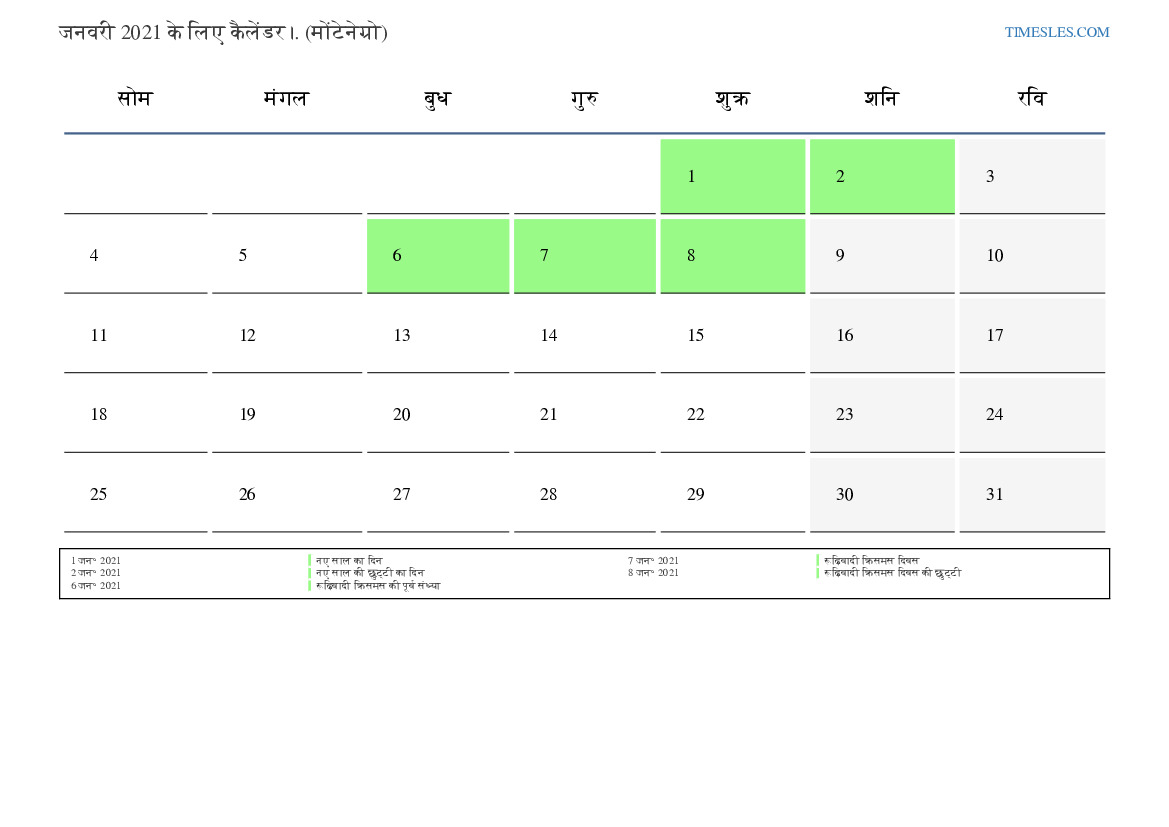 मोंटेनेग्रो के लिए जनवरी 2021 के लिए छुट्टियों और सप्ताहांत कैलेंडर