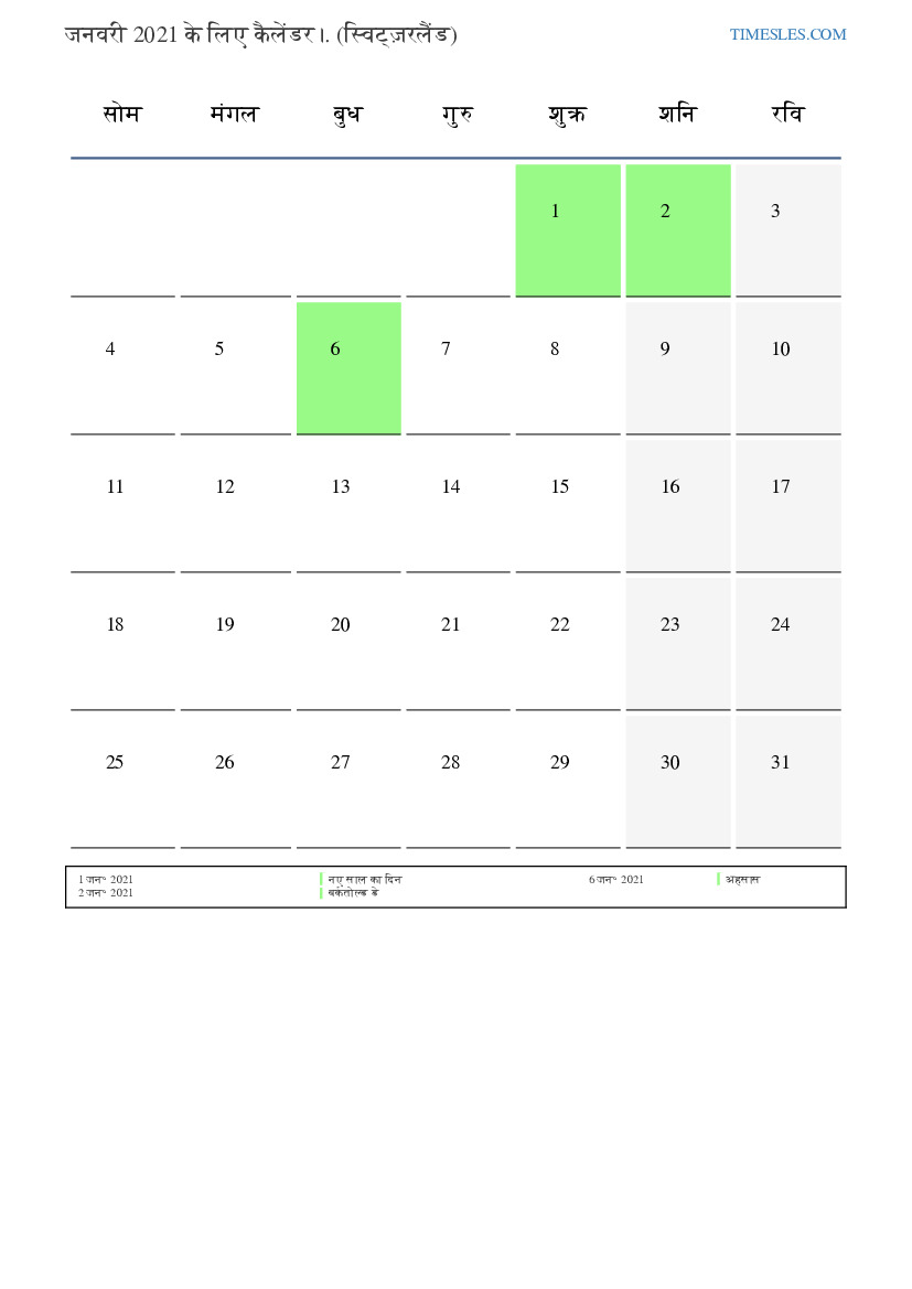 स्विट्जरलैंड के लिए जनवरी 2021 के लिए छुट्टियों और सप्ताहांत कैलेंडर