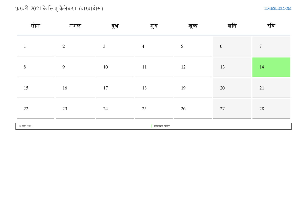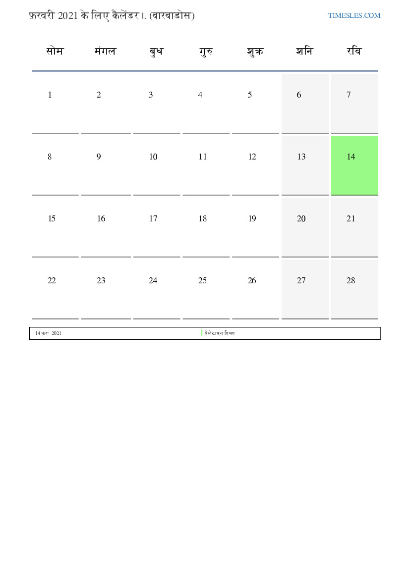 बारबाडोस के लिए फ़रवरी 2021 के लिए छुट्टियों और सप्ताहांत कैलेंडर