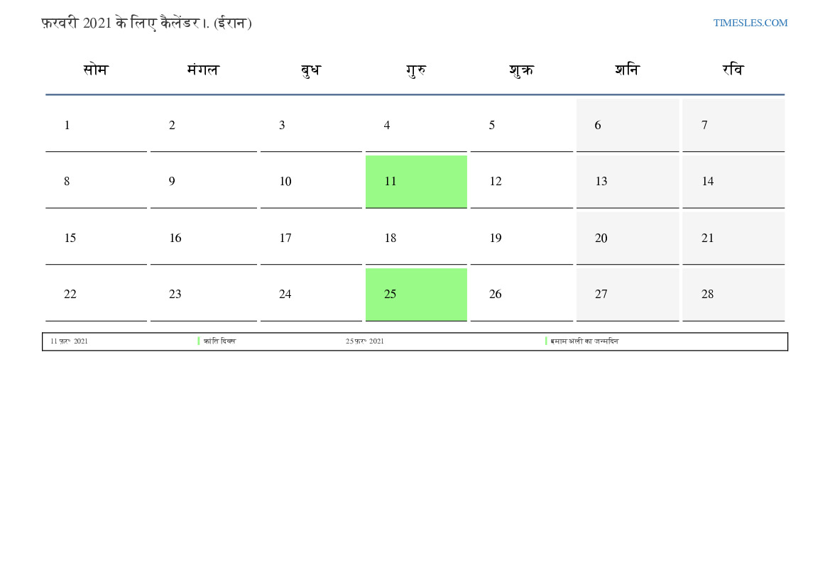 ईरान के लिए फ़रवरी 2021 के लिए छुट्टियों और सप्ताहांत कैलेंडर