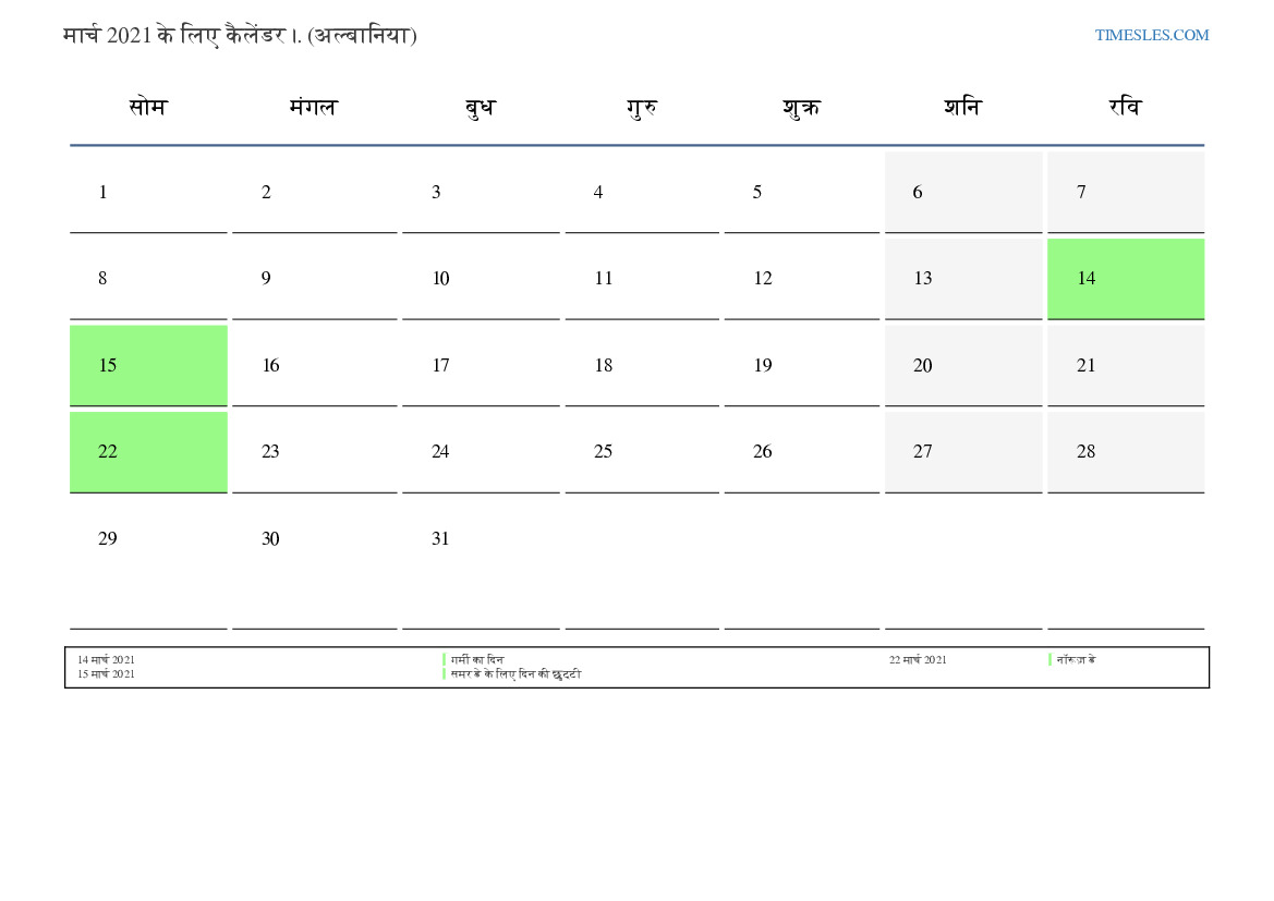 अल्बानिया के लिए मार्च 2021 के लिए छुट्टियों और सप्ताहांत कैलेंडर