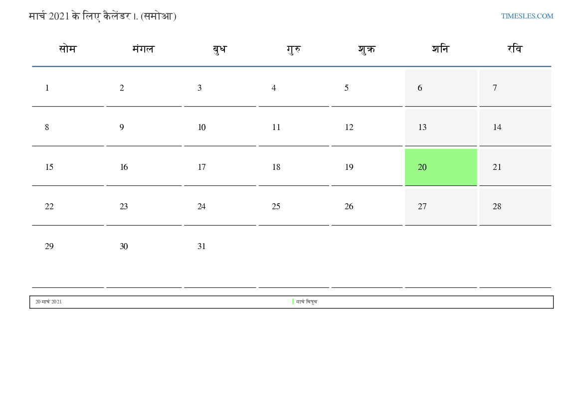 समोआ के लिए मार्च 2021 के लिए छुट्टियों और सप्ताहांत कैलेंडर