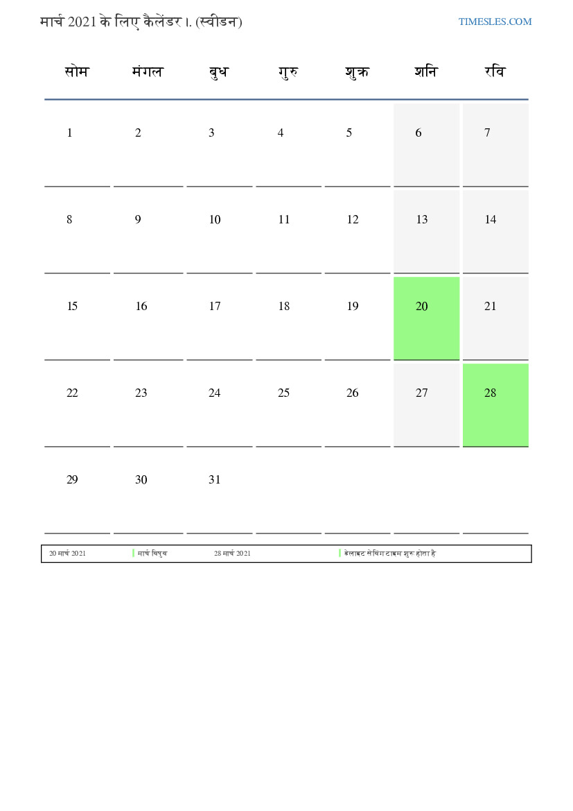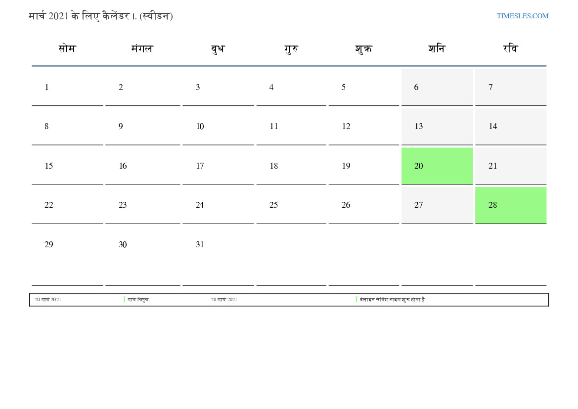 स्वीडन के लिए मार्च 2021 के लिए छुट्टियों और सप्ताहांत कैलेंडर
