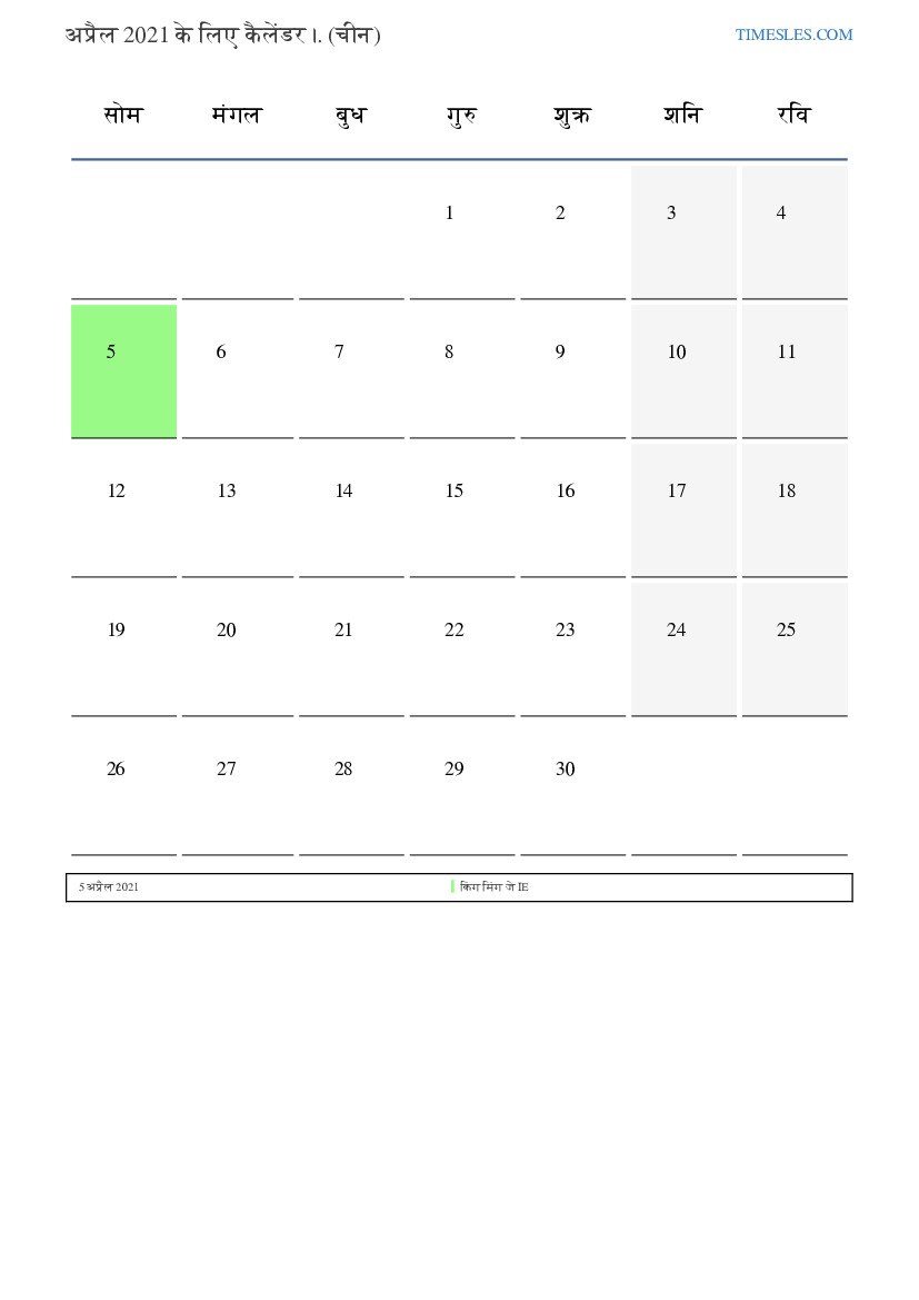 चीन के लिए अप्रैल 2021 के लिए छुट्टियों और सप्ताहांत कैलेंडर