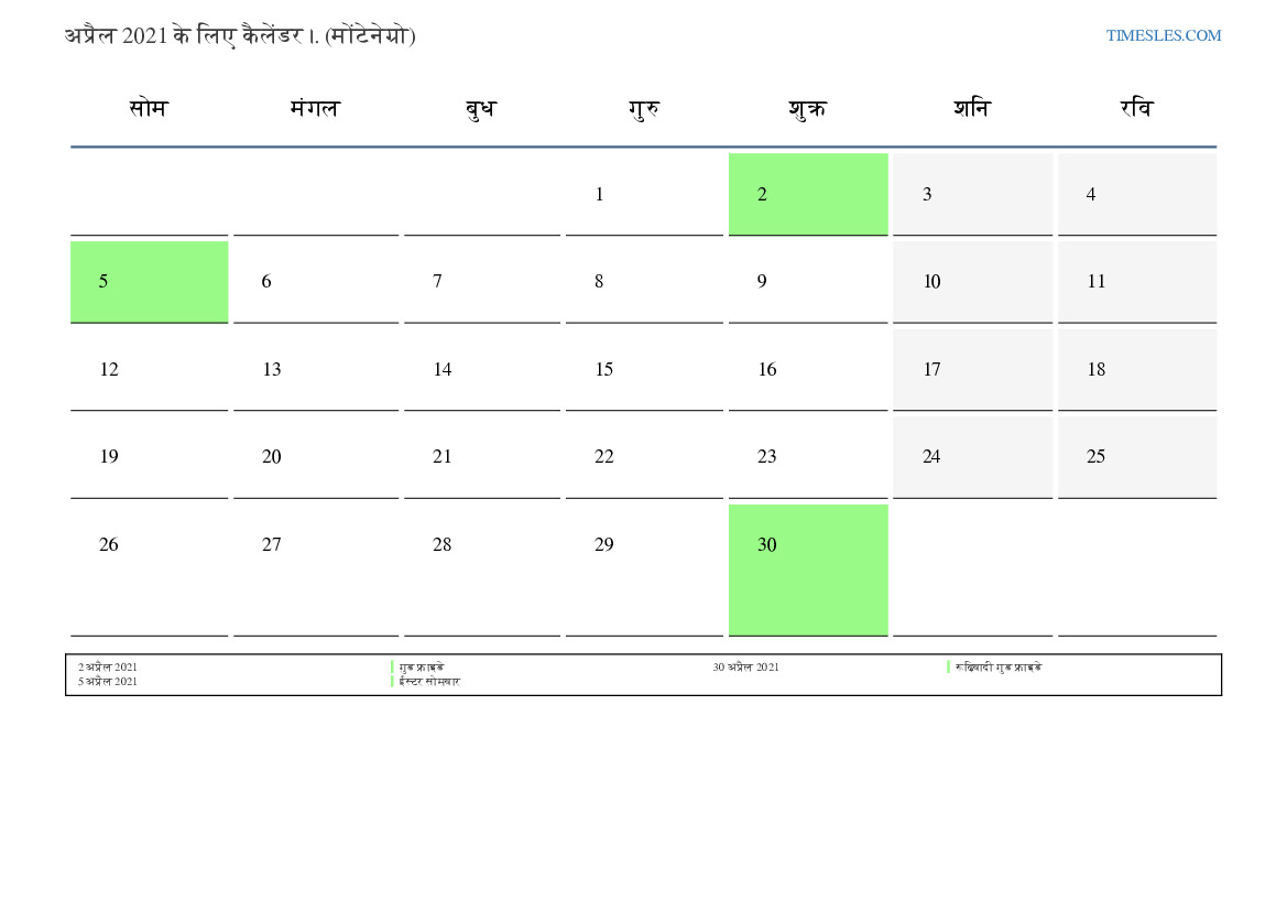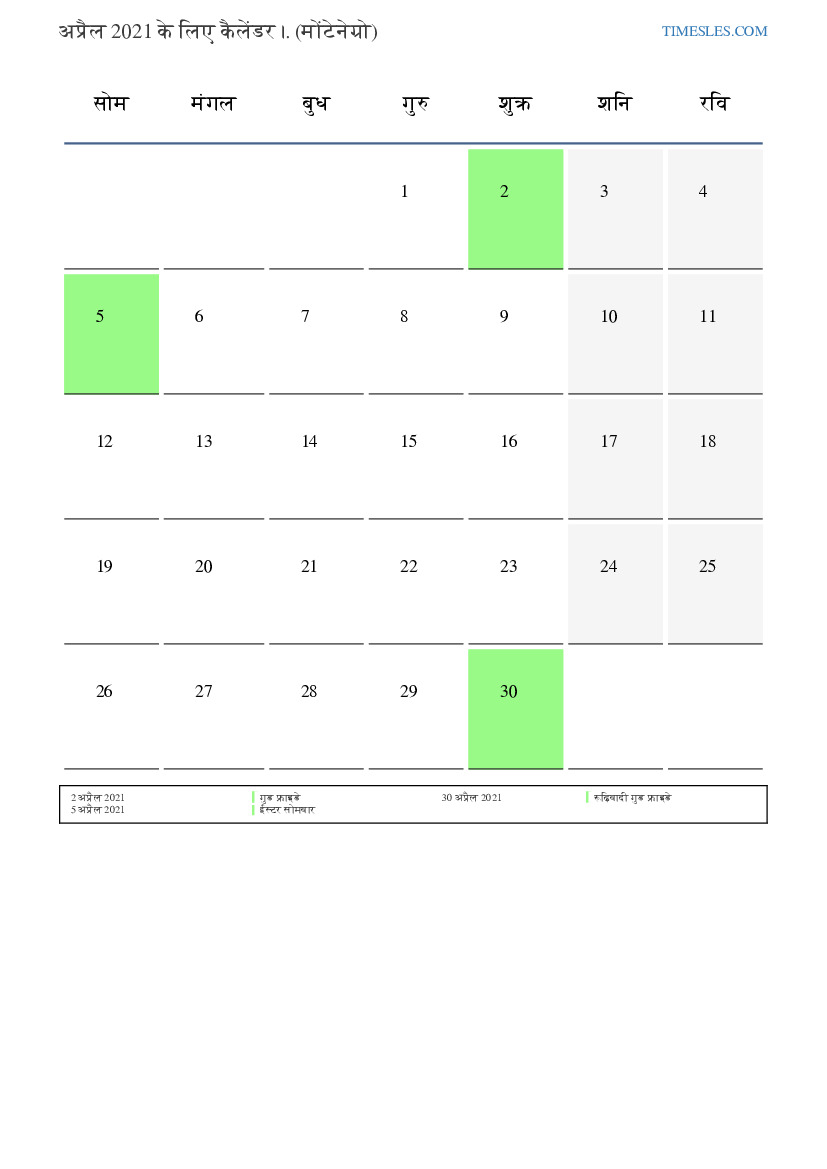 मोंटेनेग्रो के लिए अप्रैल 2021 के लिए छुट्टियों और सप्ताहांत कैलेंडर