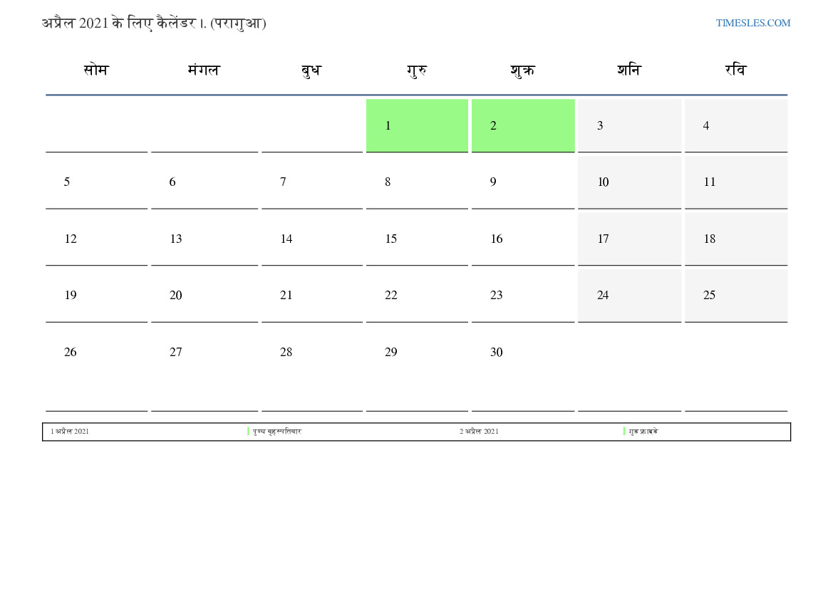 अप्रैल के महीने में 30 दिन होते हैं। यह 2021 का 4 महीना है। वर्ष का मौसम: बहार ह। अप्रैल का महीना गुरुवार को शुरू होता है और शुक्रवार को समाप्त होता है। अप्रैल 2021 के महीने में, पराग्वे में 2 छुट्टियां और दिन बंद।