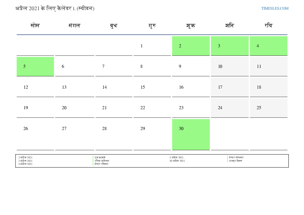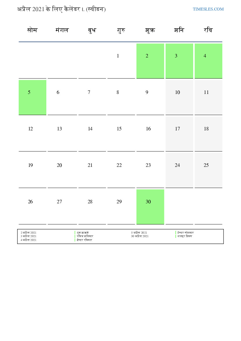 स्वीडन के लिए अप्रैल 2021 के लिए छुट्टियों और सप्ताहांत कैलेंडर