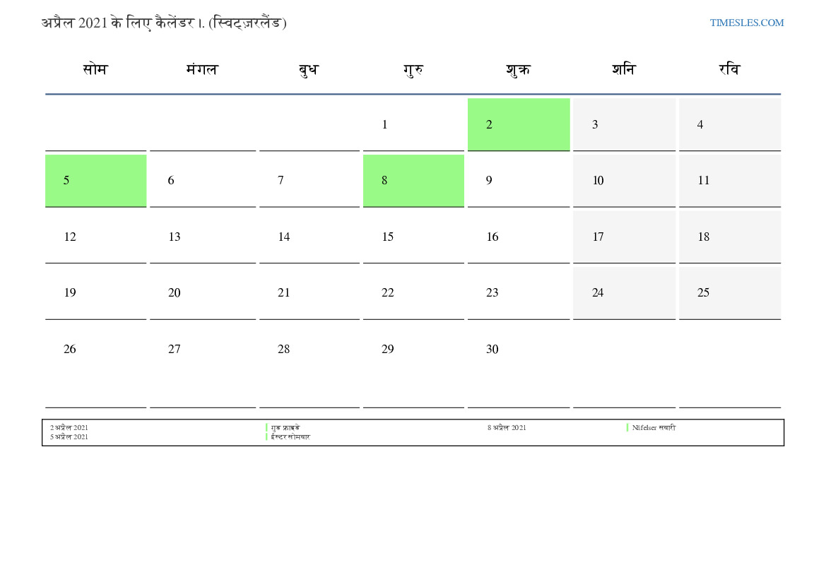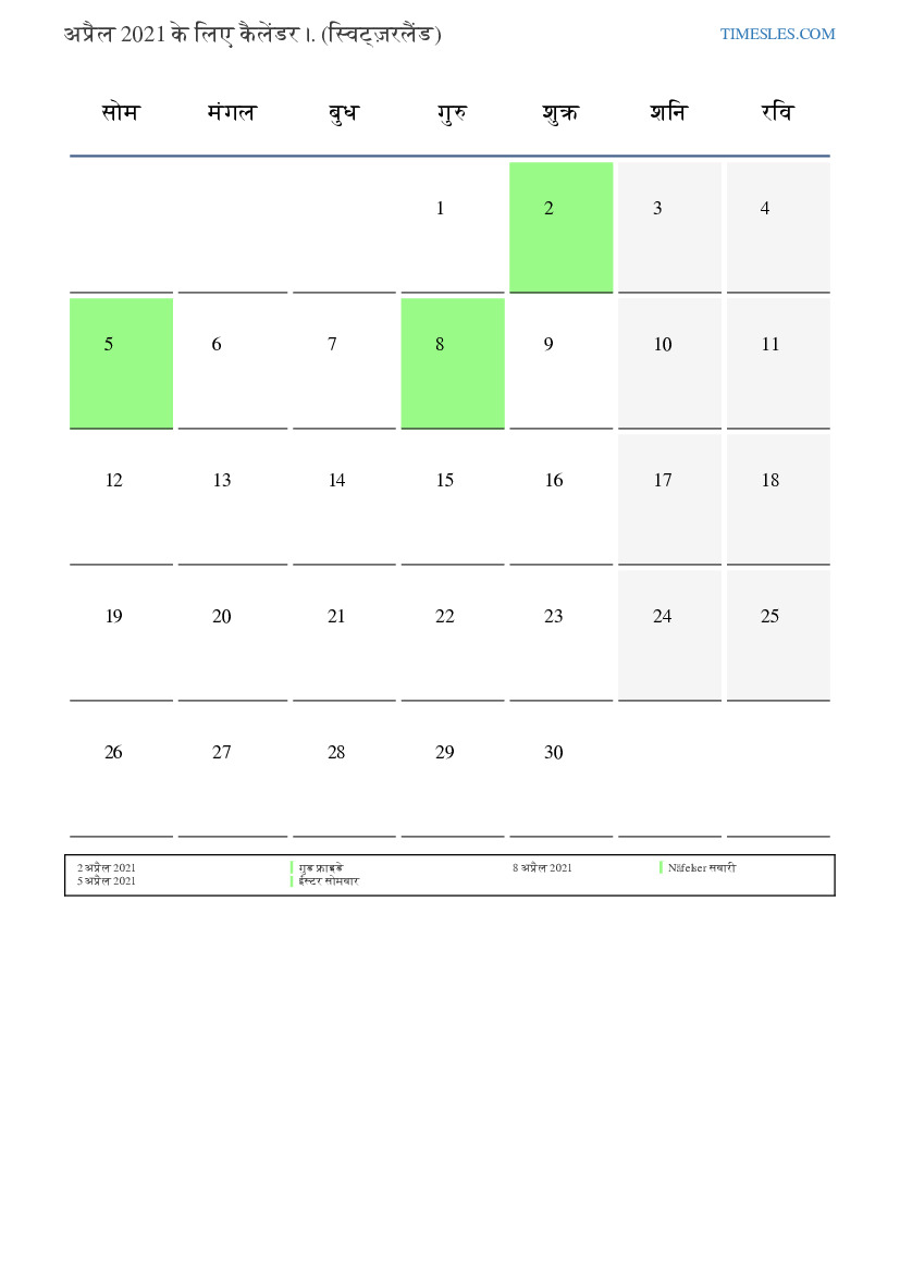 स्विट्जरलैंड के लिए अप्रैल 2021 के लिए छुट्टियों और सप्ताहांत कैलेंडर