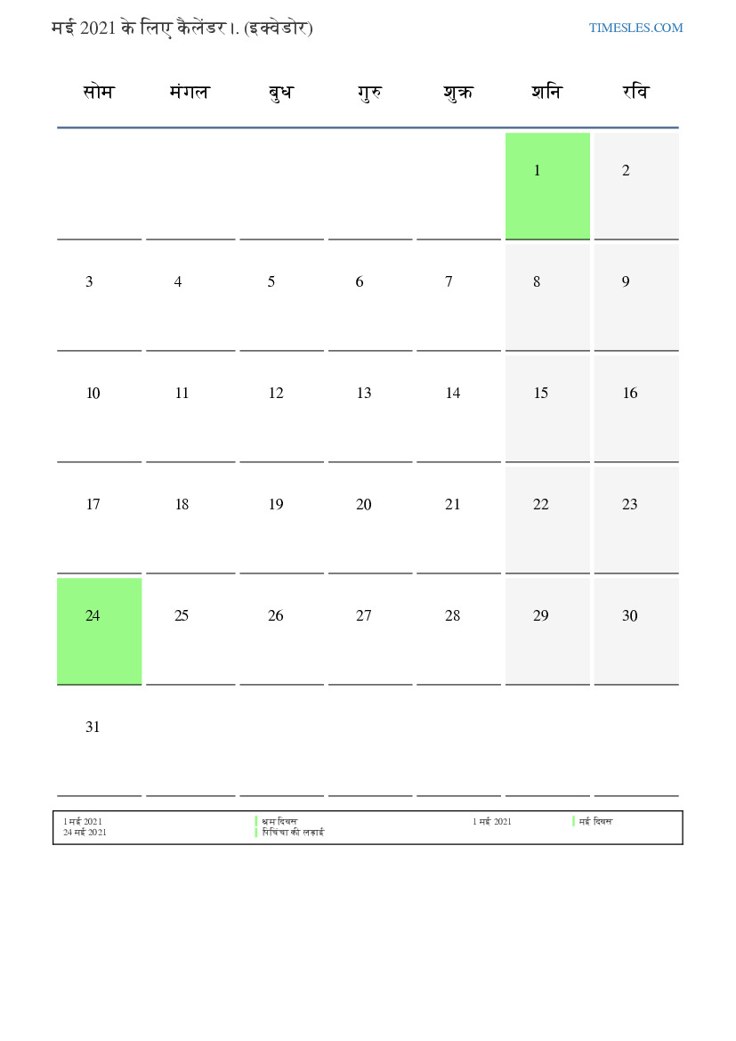 इक्वाडोर के लिए मई 2021 के लिए छुट्टियों और सप्ताहांत कैलेंडर