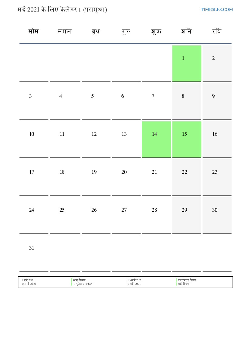 मई के महीने में 31 दिन होते हैं। यह 2021 का 5 महीना है। वर्ष का मौसम: बहार ह। मई का महीना शनिवार को शुरू होता है और सोमवार को समाप्त होता है। मई 2021 के महीने में, पराग्वे में 4 छुट्टियां और दिन बंद।