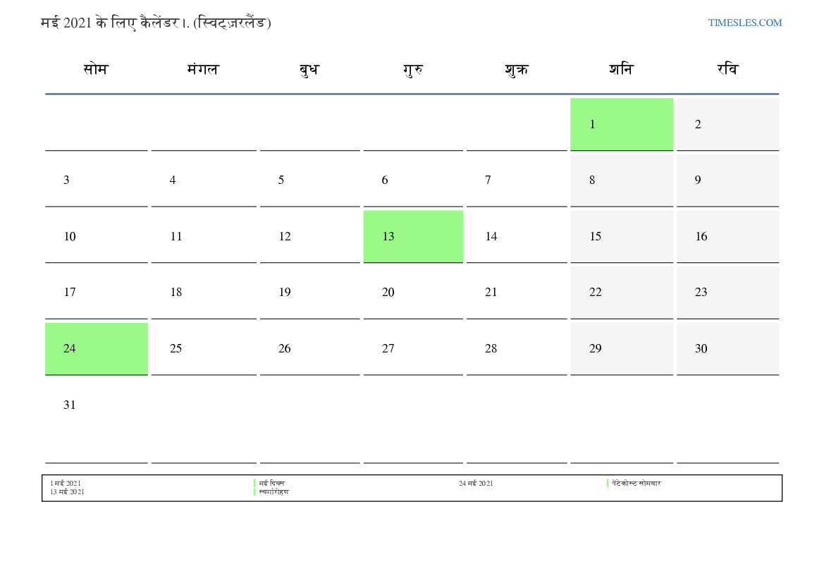 स्विट्जरलैंड के लिए मई 2021 के लिए छुट्टियों और सप्ताहांत कैलेंडर
