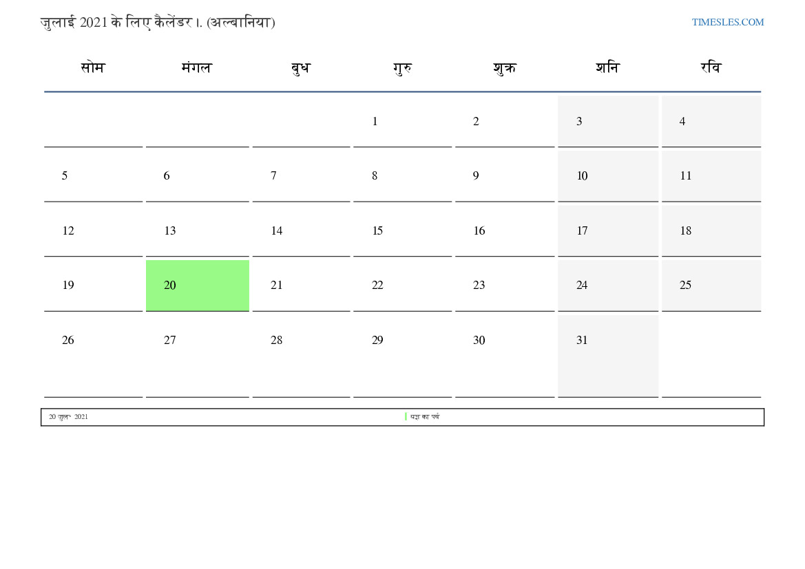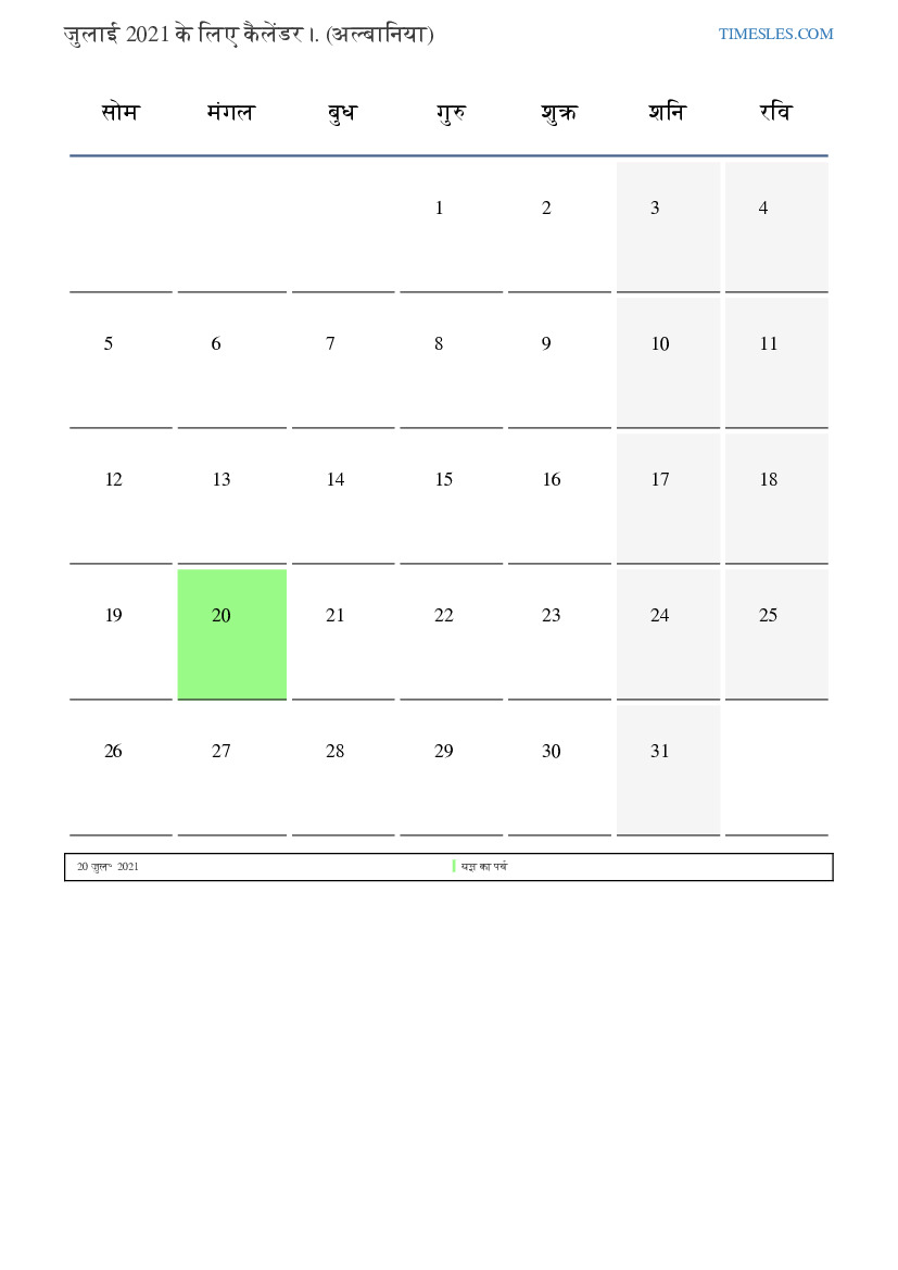 अल्बानिया के लिए जुलाई 2021 के लिए छुट्टियों और सप्ताहांत कैलेंडर