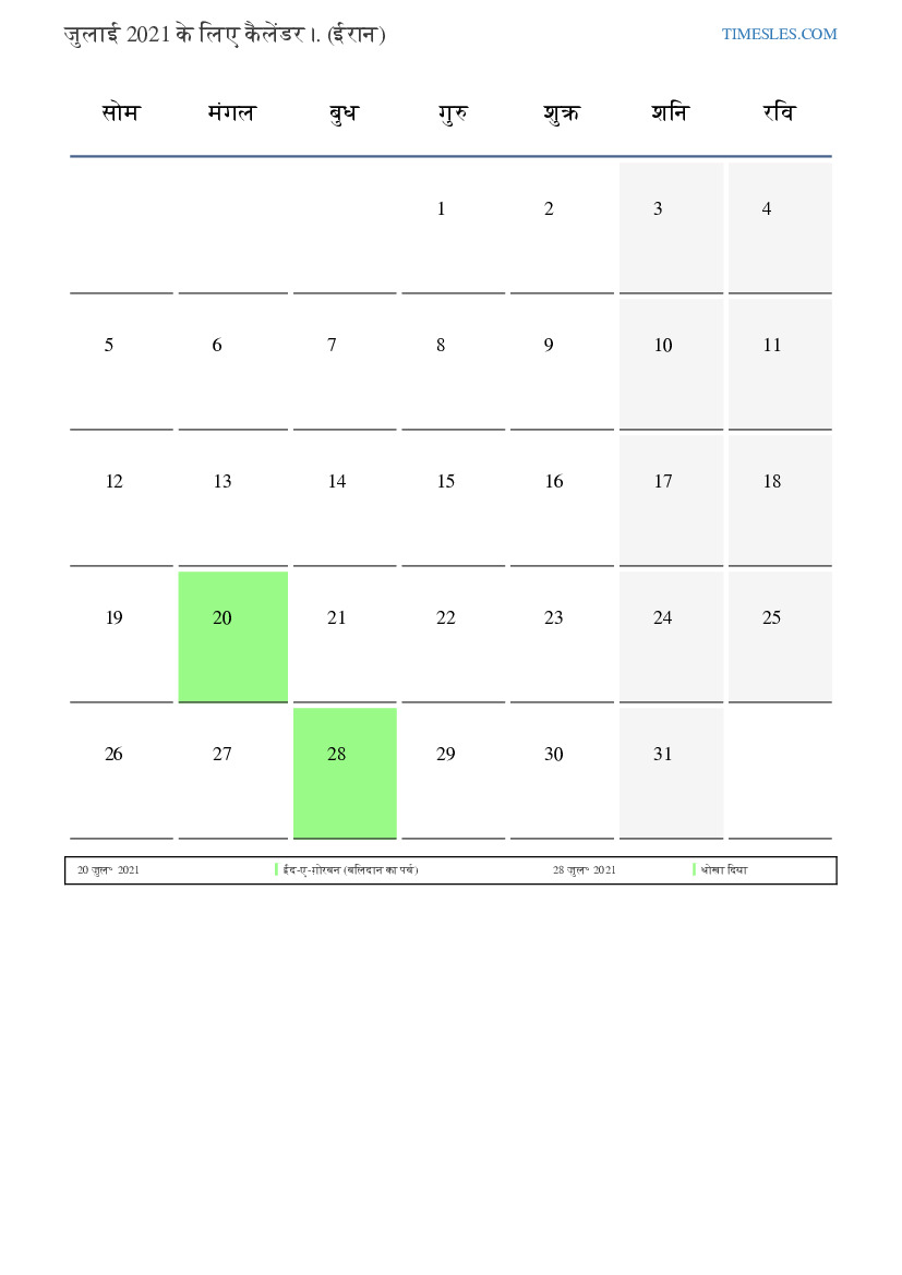 ईरान के लिए जुलाई 2021 के लिए छुट्टियों और सप्ताहांत कैलेंडर
