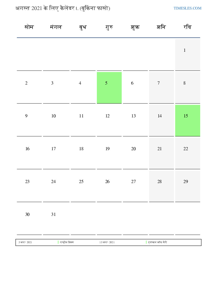 बुर्किना फासो के लिए अगस्त 2021 के लिए छुट्टियों और सप्ताहांत कैलेंडर