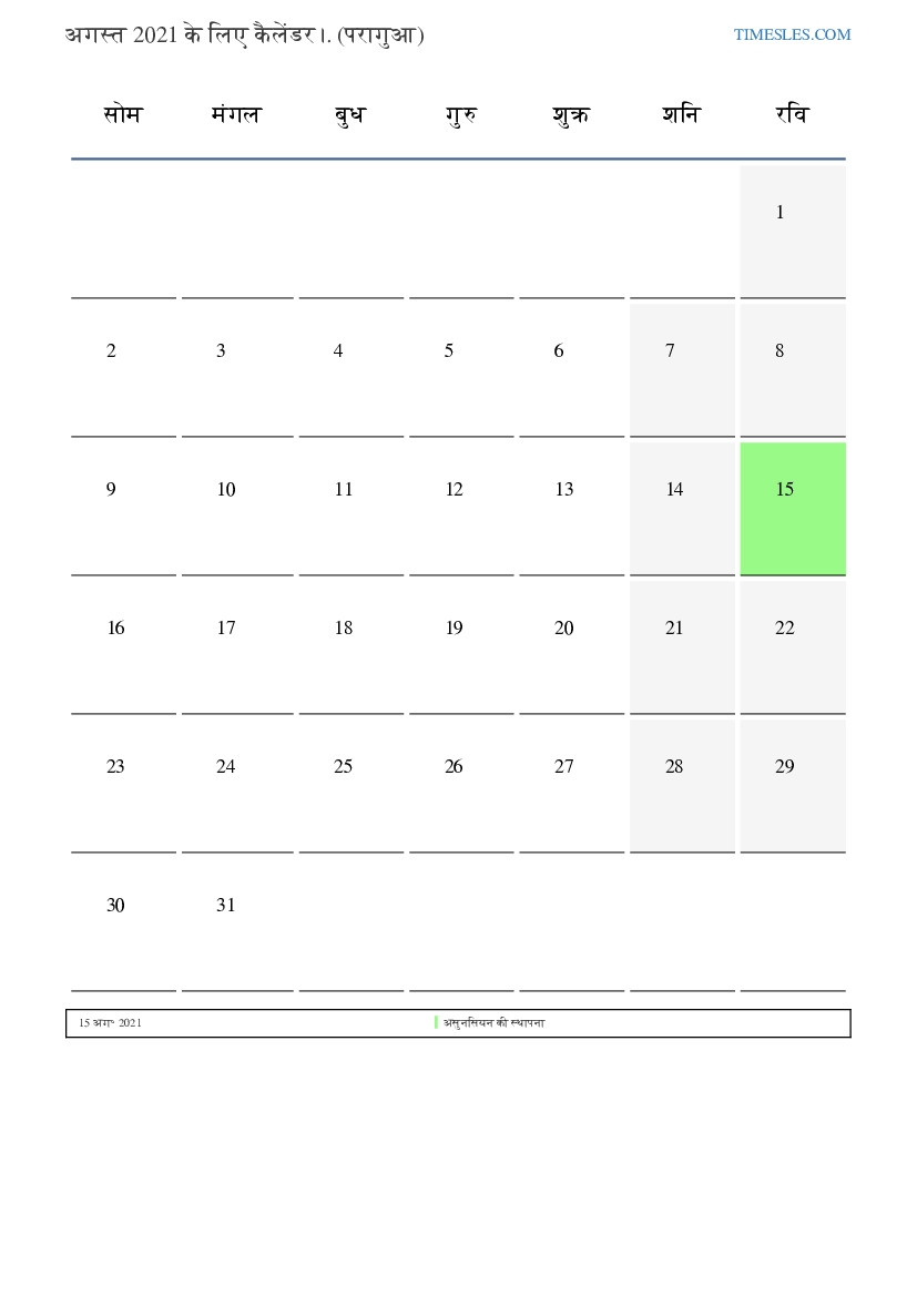 अगस्त के महीने में 31 दिन होते हैं। यह 2021 का 8 महीना है। वर्ष का मौसम: गर्मी। अगस्त का महीना रविवार को शुरू होता है और मंगलवार को समाप्त होता है। अगस्त 2021 के महीने में, पराग्वे में 1 छुट्टी और दिन।