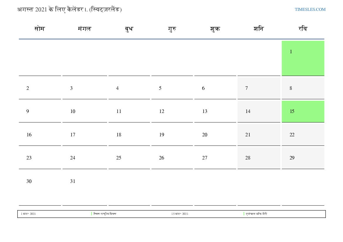 स्विट्जरलैंड के लिए अगस्त 2021 के लिए छुट्टियों और सप्ताहांत कैलेंडर