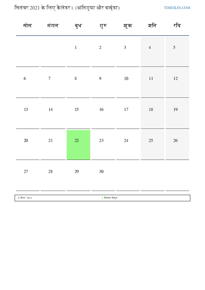 सितंबर के महीने में 30 दिन होते हैं। यह 2021 का 9 महीना है। वर्ष का मौसम: पतझड़। सितंबर का महीना बुधवार को शुरू होता है और गुरुवार को समाप्त होता है। सितंबर 2021 के महीने में, एंटीगुआ और बारबुडा में 1 छुट्टी और दिन।